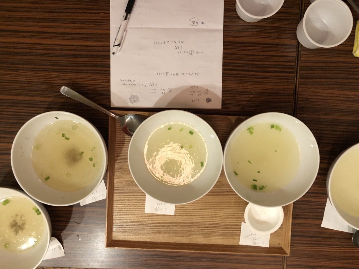 ↑ワインテイスティングかのように、色んな調理法の鶏ガラスープをみんなでたくさん味見しました、、!