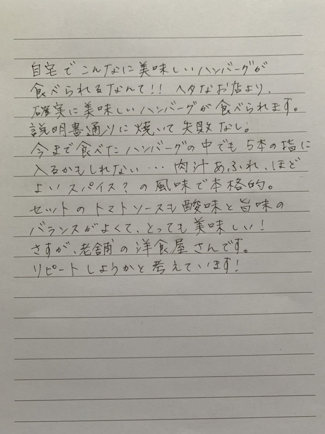 私も小さい頃に家族とよく行きました。 写真を見ると、改装されてガラッと雰囲気が変わってますね。 コロナで大変だと察しますが、前向きに頑張ってらっしゃいますね。 こちらが元気を頂いてる気分になります。 応援しています。そして、思い出のハンバーグを楽しみにしています。
