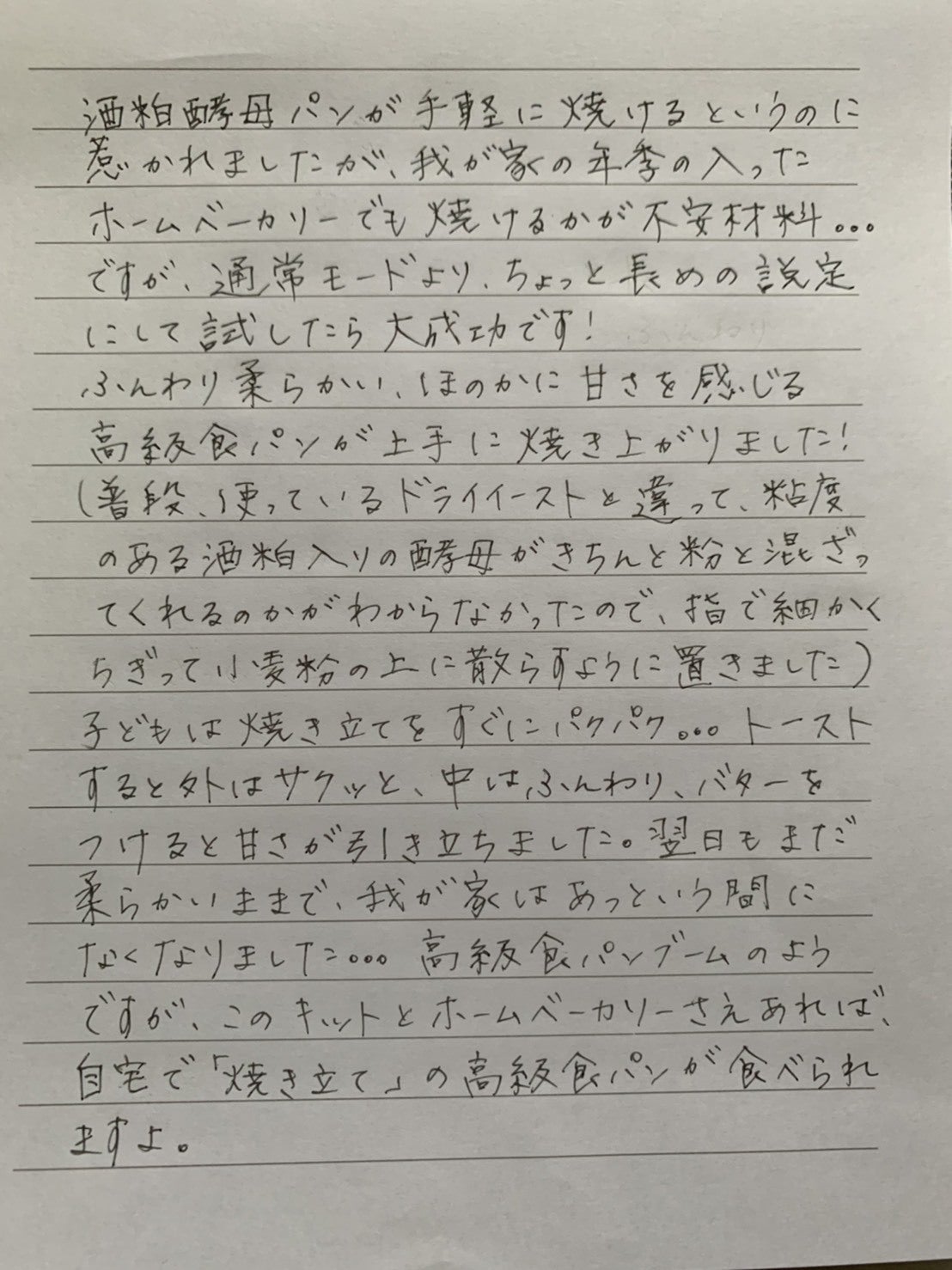 ・当製品は、調整済み強力粉と別袋で天然酵母・酒粕・四つ葉バターで1斤分に分かれていおり、ホームベーカリーをお持ちでない方もお楽しみいただけます。