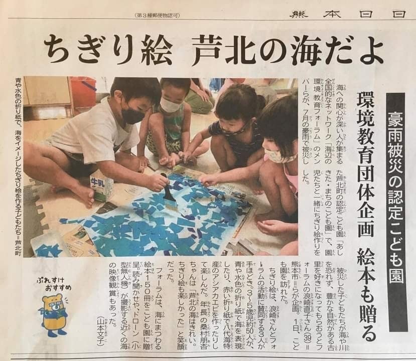 甚大な被害を受けた地域の保育園にも伺いました。この時は天草ドローンワークスの倉田さんにご協力いただき、ドローンを利用した自然観察会も実施しました。普段足を運ぶことのないという海を上空から見ることができるだけでなく、自分の住む街がどんなに自然豊かな場所なのかを実感することができました。この活動の様子とドローンの映像は、こちらからもご覧いただけます。また本活動は、9月8日の熊本日日新聞朝刊にも創作活動の様子を掲載いただきました。
