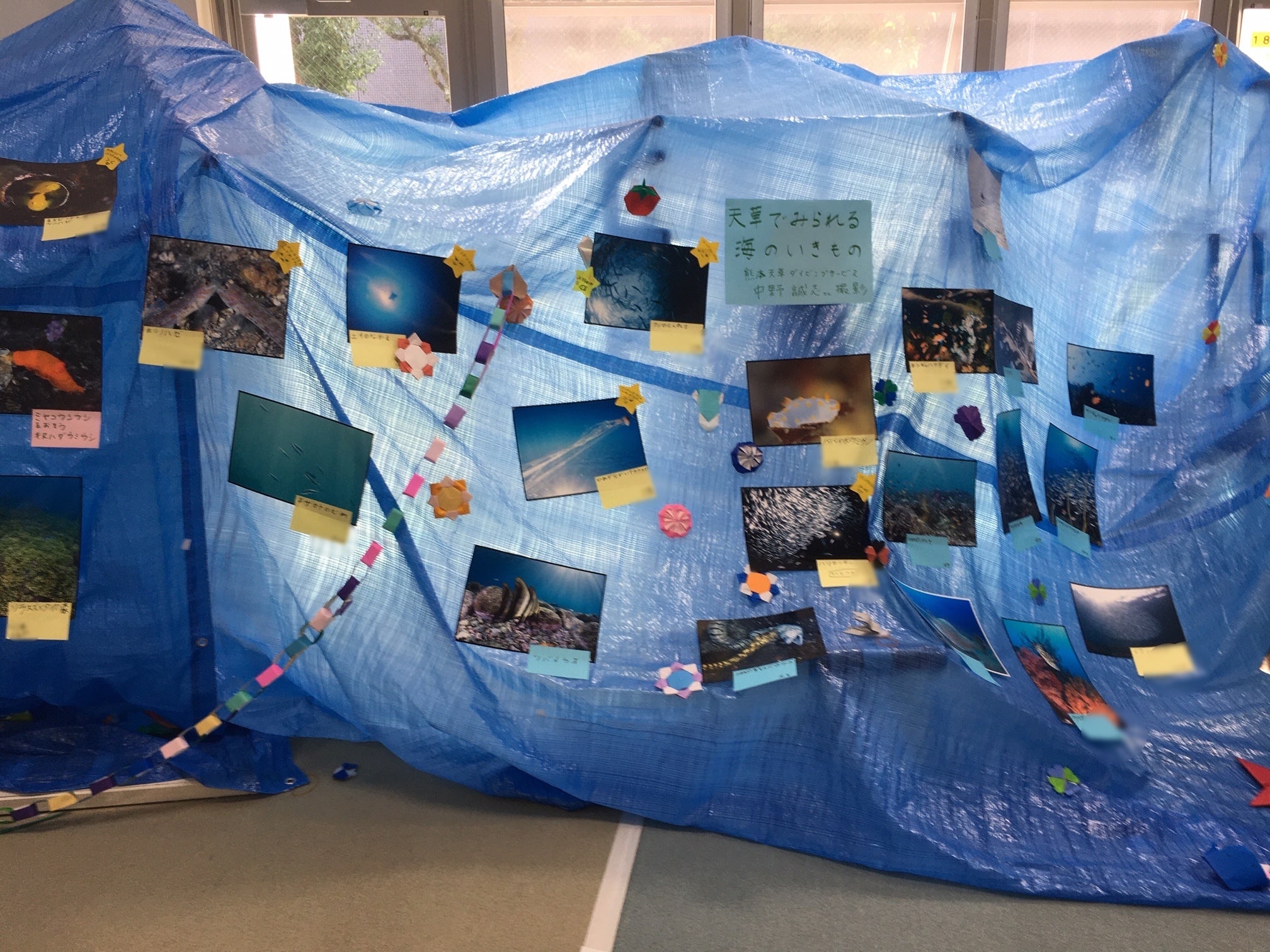 同じ避難所にて、天草水中写真を撮影する熊本ダイビングサービスよかよかの中野誠志さんから天草の海の写真をお借りして、子どもたちとともに海の手作り写真展を作りました(下の写真)。
