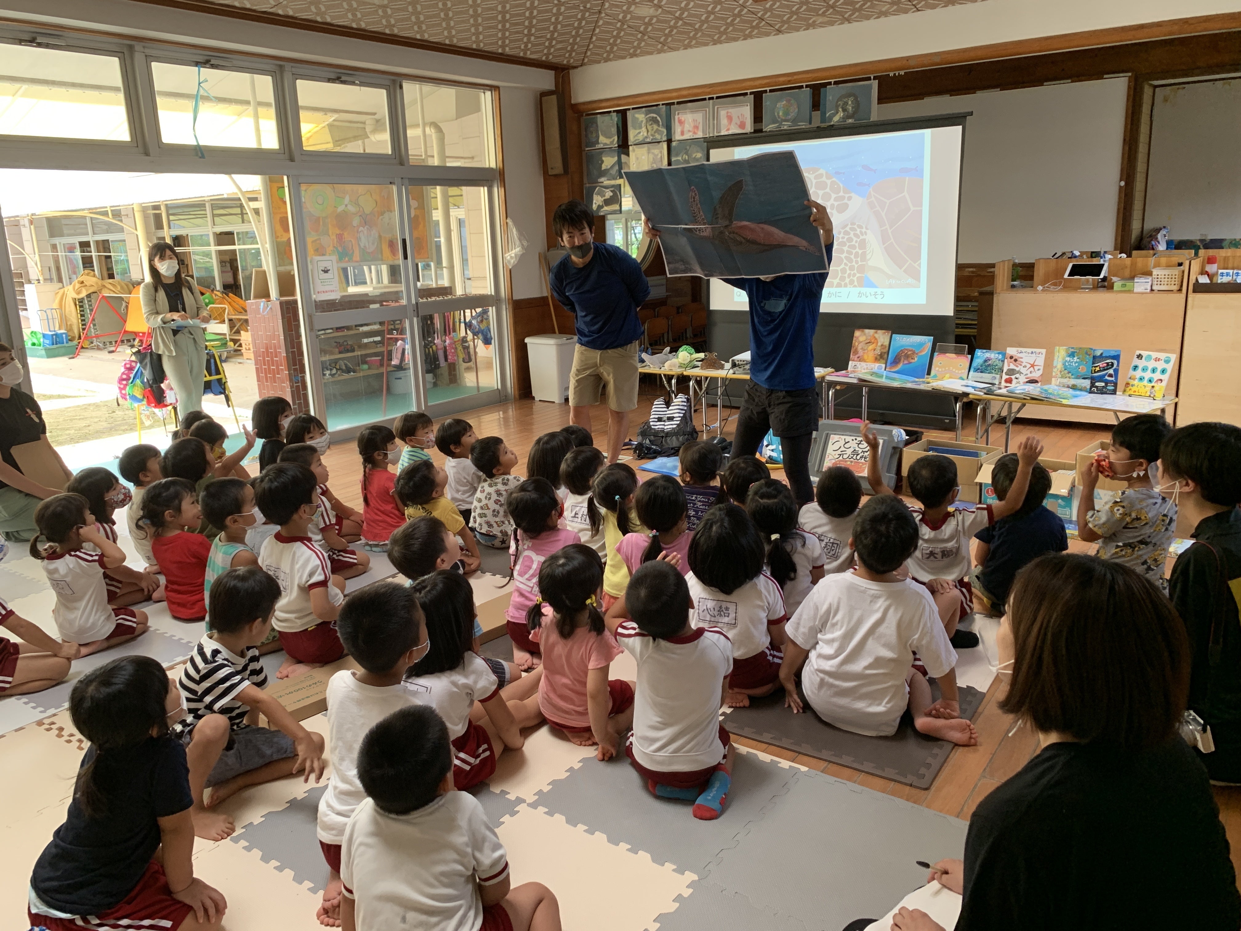 2021/12/10 15:33コロナで1月よりずっと延期になっていましたが、ついに、2021年12月9日(木)、芦北町にある保育園「田浦保育園」に海のこども元気箱をお届けすることができました。田浦保育園は、海のこども元気箱のメンバーである松本祐輔さんの子供さんが通う保育園です。松本さんご自身も一昨年の熊本豪雨で被災され、ご自宅が浸水する中大変な思い出お子さんと一緒に避難されました。田浦では地域の一部が水害の被害に遭われたそうです。この日は、元気いっぱいの3・4・5歳児さん合計60名が、海のお話会に参加してくれました。実施した支援内容は以下のとおりです。①田浦の海のお話し会松本祐輔さんが、半魚人のお面をかぶって登場。田浦の海の素晴らしさを知ってほしいと、在園児のおじいちゃんでもある漁師さんに船に乗せてもらい、漁体験した時の映像を見ながら、田浦の海でどんな魚がとれるのか紹介しました。ヒラメにタチウオにサワラ など、この日は大漁!「すぐ近くでこんなに魚がとれるんだー」と驚きの声があがりました。②海のクイズ&海の絵本のお届け身近な海に住む生き物のクイズを実施しました。タツノオトシゴのクイズの後、水俣ダイビングサービス SEA HORSEの森下誠さんからお借りしたタツノオトシゴの産卵行動の映像を見ました。ワイワイ賑やかな子どもたちでしたが、映像を流すとピタッと声ががやんで釘付けになっていました。クラウドファンディングの寄付金で購入した絵本、海の絵本作家である友永たろさんとなかのひろみさんから寄贈いただいた海の絵本、リモート支援メンバーの小川結希が森の幼稚園に集うママ友から集めてくれた絵本や電車のおもちゃ、さらには埼玉県にある「ありがとう。book」様からご寄贈いただいた絵本などなど、絵本約200冊を田浦保育園にお届けすることができました。また海の塗り絵やペーパークラフトのお面などもお届けしました。②ドローンLIVE映像放映倉田直彰さんがドローンで保育園から海を見に行こう!ということで、保育園の園庭から海までドローンを飛ばして、室内でドローンのライブ映像を見せてくれました。「海から船が出てるー」「この道通ったことある!」と歓声があがりました。子どもたちからは、「楽しかったー!」「ドローンかっこよかった。」などの感想がありました。田浦保育園では、絵本の貸し出しも行っていて、今後寄贈した絵本を有効活用くださるそうです。園長先生からは、田浦保育園の系列保育園である吉尾保育園では周囲の水害の被害が特に大きく、水害で集落の維持が困難になりつつあるほど人が減ってきたというお話を聞きました。水害から1年半が経とうとしていますが、今もなお爪痕は残り復興途上にあることを改めて感じました。クラウドファンディングでご支援くださった皆様、映像提供、本の提供など、ご支援くださいました皆様に、心よりお礼申し上げます。 もっと見る