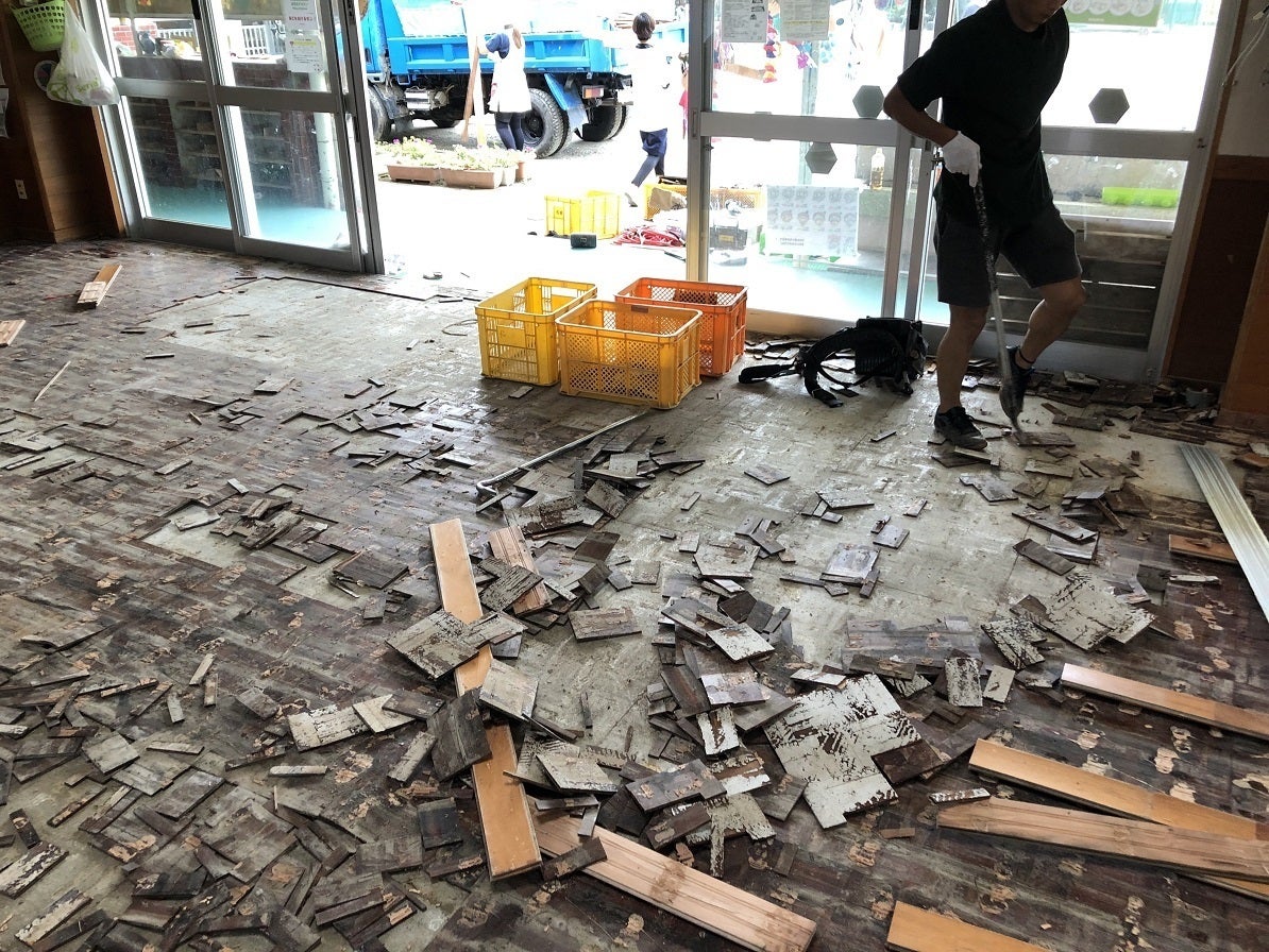 被災地では、敷地全体が水に浸かってしまった保育園も多くあります。8月中旬に伺った「あしきた・まちのこども園」は、冠水と土砂崩れで、保育園までの3つの道が全てしばらく通れない状況でした。園舎も床上浸水し、まずは教室の床だけでも張り替えを行い、なんとか保育を再開している状況です。1000冊以上あった絵本の約半数以上が水に浸かり、そのほとんどを処分したとのことでした。避難所や避難先の親戚宅から通う園児もいます。園もご家庭もいまだ大変な状況です。