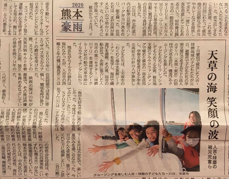 11月1日(日)の熊本日日新聞朝刊に、10月31日に開催した「天草の海体験」イベントの記事を掲載いただきました。子どもたちのこの笑顔!帰りのバスの中、照れながらも笑顔で「イルカの群れは見えなかったけど全部楽しかったです」と感想を話してくれました。後日、 参加者と支援くださった皆様限定で、思い出ムービーをお届けしようと思っております。どうぞお楽しみに!