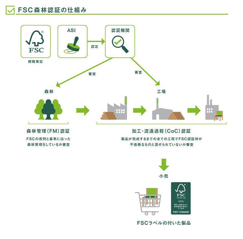 森林認証制度FSCより認定を受けた適切に管理された森から伐採された木材のみを使用し