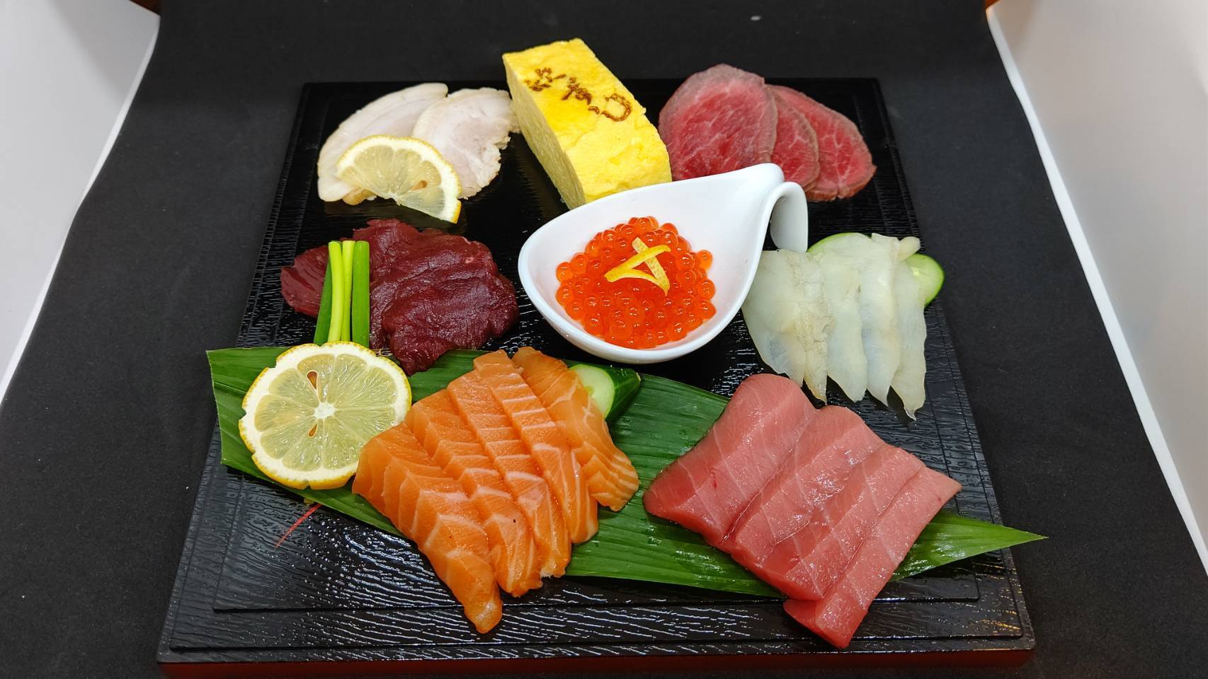 今回、みなさまにお届けさせていただきますのは、欣ずし特製おせち料理、オードブルです。目玉は、天然本マグロ中トロ、北海道蝦夷しか刺身(小鹿のため柔らかいです)、ふぐ刺し、ふぐの生ハム、とらふぐの唐揚げです。