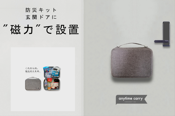 そこで開発したのが玄関のドアに磁力で張り付く防災キットです。スペースがなくても設置でき、いつでもすぐ持ち出せる利便性を備えています。