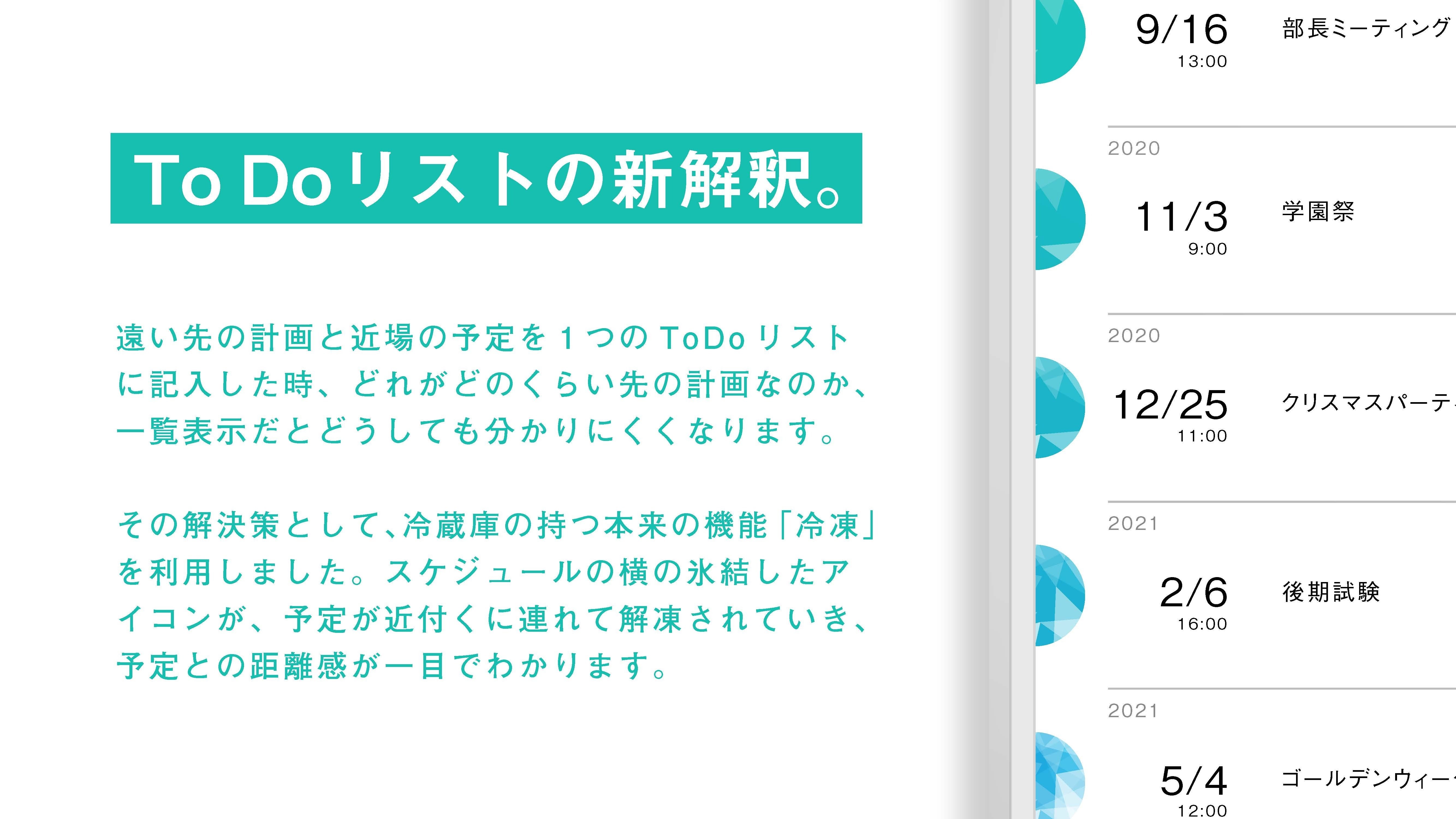 下段にはTo doリスト機能の冷凍庫。1ヶ月先や1年先の予定、表示画面の上に行くにつれて近い日時の予定が並ぶように。氷をコンセプトに、上に行くにつれて解凍されていくデザインで予定との距離感が一目でわかる。