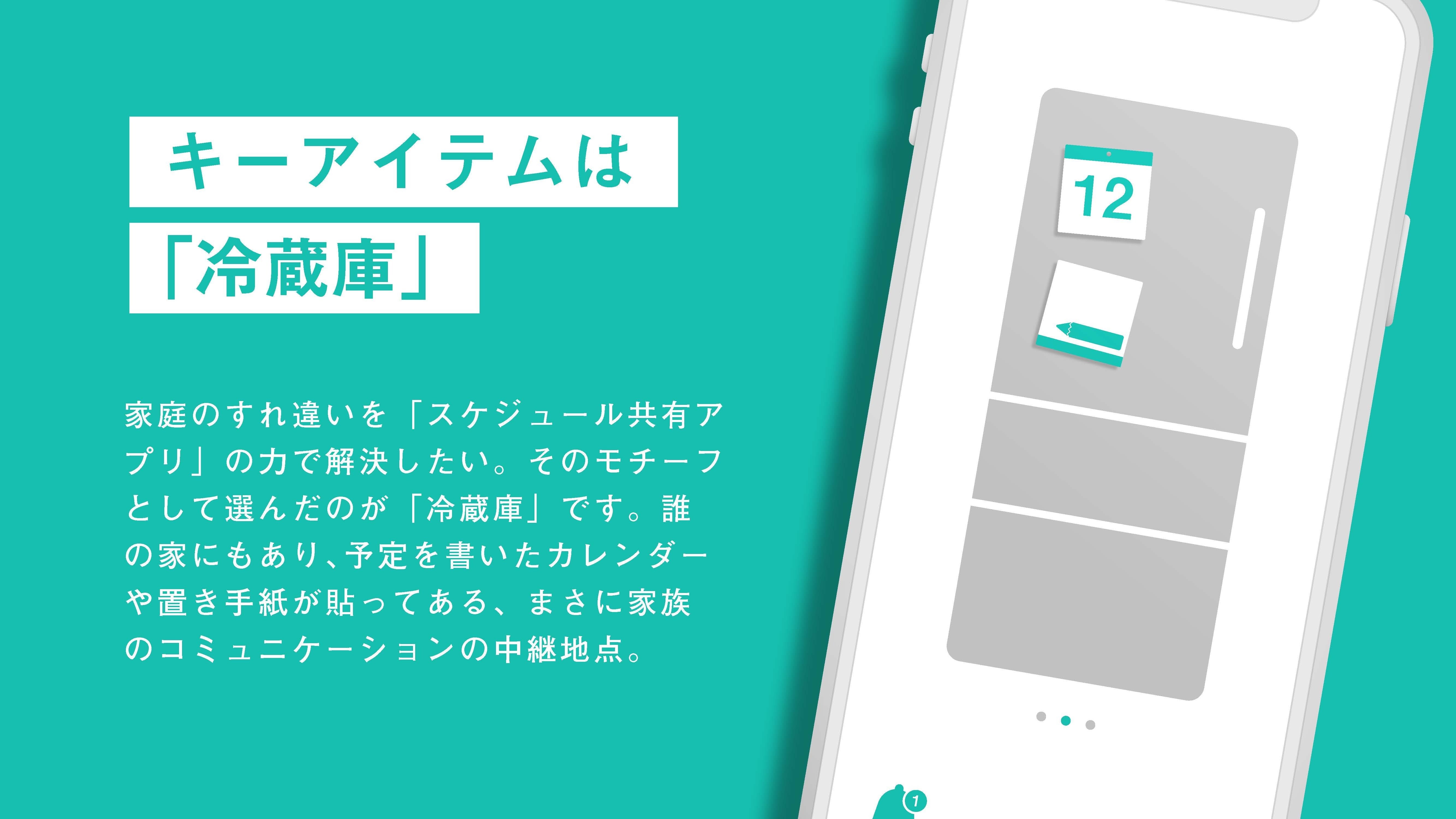 冷蔵庫は本来、「冷蔵」「冷凍」などの機能がありますが、僕の家ではカレンダーや置き手紙を貼ってスケジュールを共有する役割も担っていました。このことから冷蔵庫は家族のコミュニケーションの中継地点になっていると考え、アプリのモチーフに冷蔵庫を選びました。