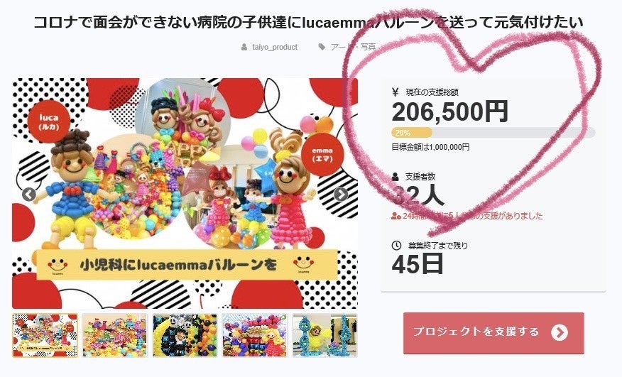 本日まで32名の方にご支援いただき、支援金20万円を突破しました。ご支援してくださった皆様、本当にありがとうございます!!目標金額は100万円です。支援額に応じてお届け出来る病院の数が決まっていきます。沢山の病院にお届け出来るよう、さらにプロジェクト達成し、病院にいる子どもたちにたくさんの笑顔を届けられるように頑張ります!ぜひ最後まで応援よろしくお願いします!!!