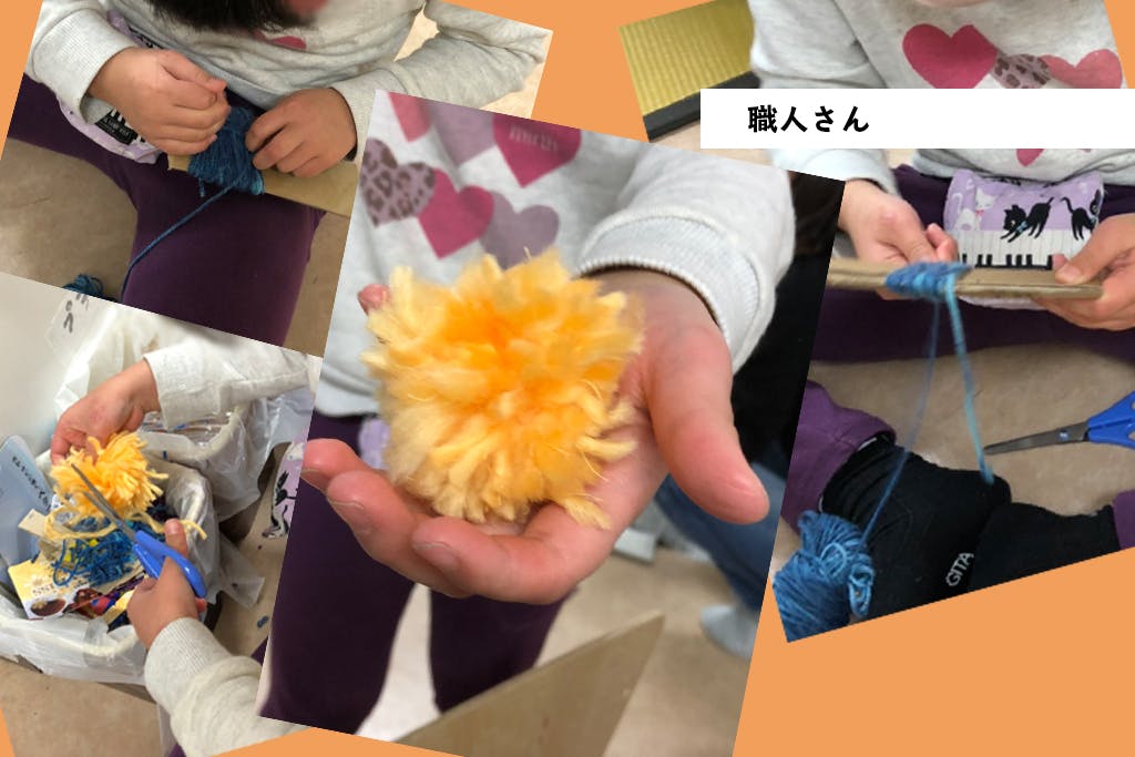 「できた!」「次はどの毛糸にしようかなぁ…」。通学帽子に山盛りのボンボンを作りました。お迎えに来たお母さんに「ねぇ、みてみて~」。お母さん、仕事帰りで疲れているだろうに、Tちゃんのボンボンを一緒に見てくれてにっこり。Tちゃんもにっこり。