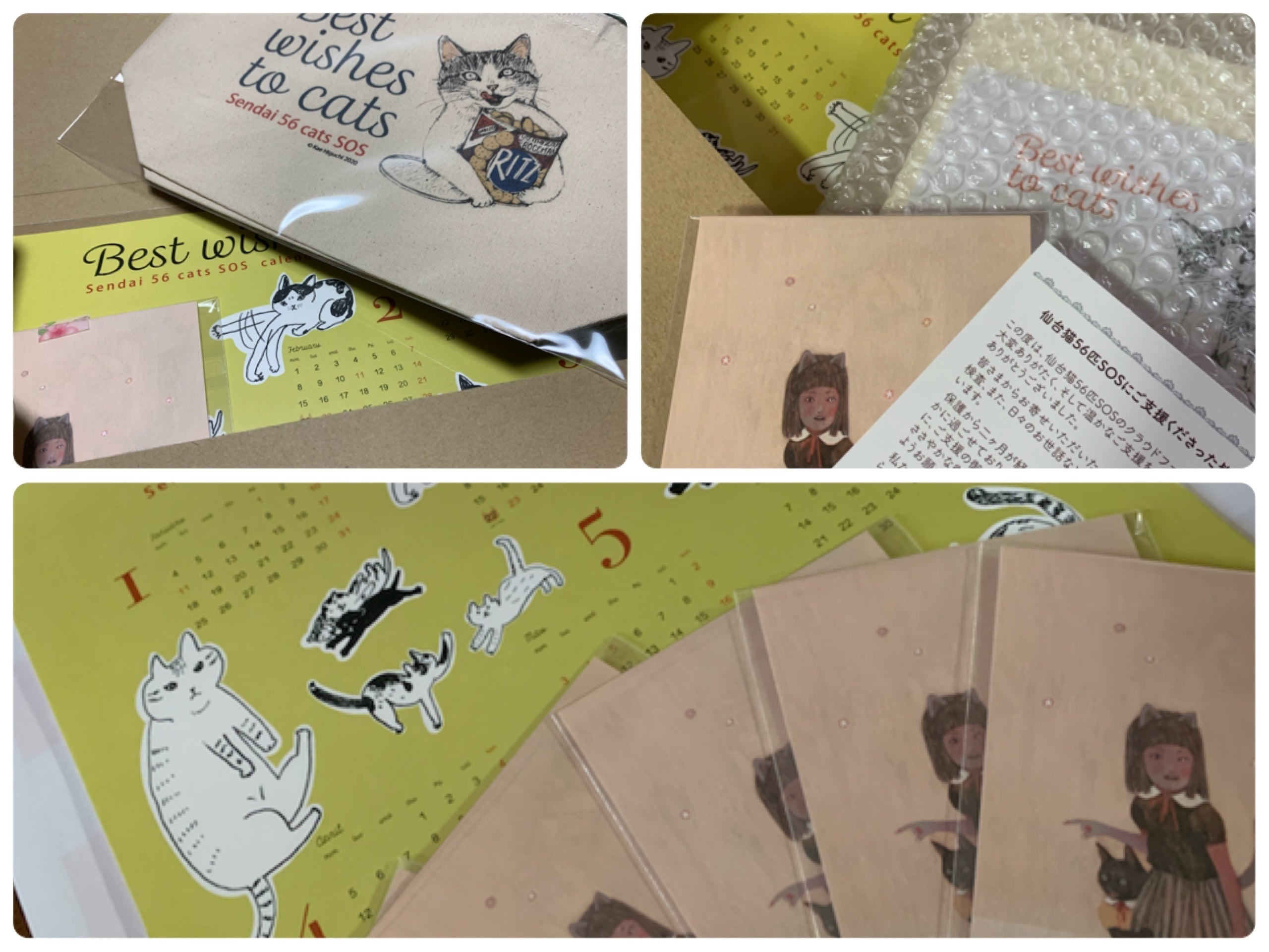 『仙台猫56匹SOS』メンバー直筆のメッセージ入りカードと、樋口佳絵さんデザインのカレンダーとポストカードを送らせていただきます。