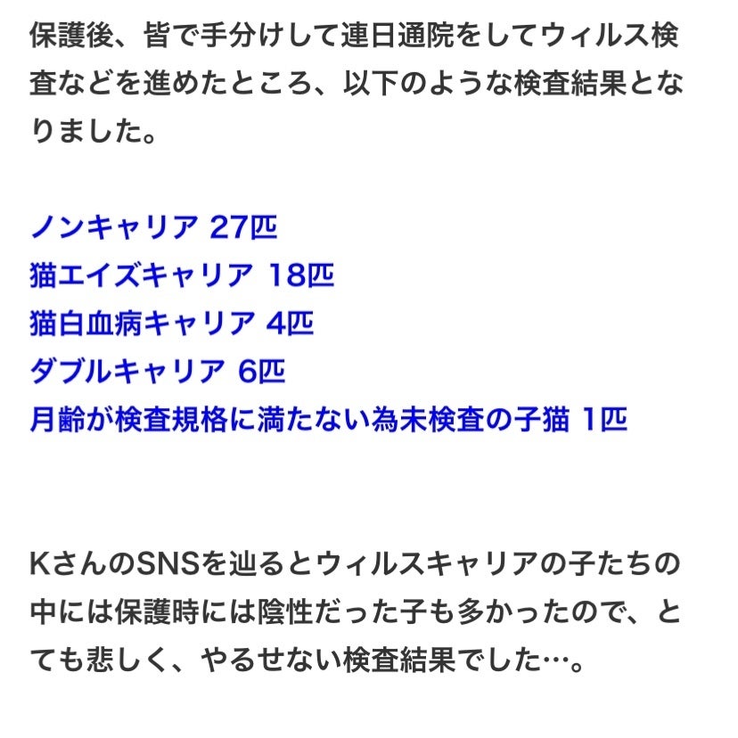 『仙台猫56匹SOS』クラウドファンディングがスタートして2日が過ぎましたが、まさかまさかの目標額の50%を超えたご支援を頂戴しておりますことに、心より感謝致します!!ブログでは公開していましたが、緊急保護をした56匹全頭の1度目のウィルス検査が終わり、写真のような結果となりました。https://ameblo.jp/sendai56catsos/KさんのSNSを遡り、保護した子たちの保護時の状況を調べてくれていたメンバーからの報告と今を突き合わせていたら、とても胸が苦しくなりました。保護時、子猫でウィルス陰性だった子が、ダブルキャリアになって、パッと見、お年寄りの猫さんかと思うような子がいたり、通院してみたら血液検査の結果がとても悪くて、預かりさんを探す余裕もなくメンバーが自宅に連れ帰りケアをしている子もいます。数少ないメンバーでの運営ですが、皆が自分に出来る精一杯をやっている中で、たった2日の間にこれだけのご支援を頂戴させて頂いたことが、本当にとても嬉しく山盛りの勇気を分けて頂いています。本当にありがとうございます。メンバー一同、猫たちと共に頑張りますので、引き続き応援とご支援を宜しくお願い致します!