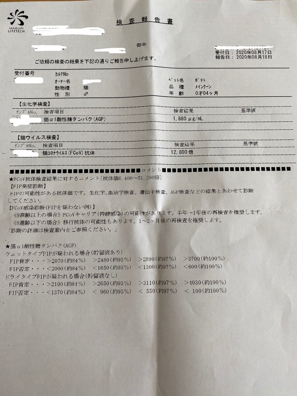 • 皆様、ポテトを見守り応援して下さり温かいご支援に感謝致します。これまでの検査結果をまとめてみました。検査結果を紙で貰える時と貰えなくて説明だけの時とあり不揃いです。ペットショップから迎え入れた3日後、様子がおかしく動物病院を受診し数日間抗生剤など投与しましたが改善せずFIPの検査結果を待っている間にも悪化し、8月15日から投薬開始しました。★1枚目…投薬前初診時の採血結果 真ん中が標準値です。RBC,HCT,HGBが低いのは貧血を表しFIPの症状の一つです。その他も異常値が多くみられていました。★2枚目…採血結果 投薬後約2週間2週間でほぼ標準値になっているのが分かります。10月にも採血してるのですが、紙で貰っていなくて説明を受け標準値でした。★3枚目…受診時、胸水が溜まっていて呼吸困難な状態でした。胸水を除去し、遺伝子検査に出した結果です。FIPほぼ100%確定。この結果はとても辛かったです。ウェットタイプは胸水、腹水が溜まりこれを除去し遺伝子検査する事ができたり、黄色くドロっとした特徴が確認できるので早期診断確定、早期治療(新薬を使うなら)につながります。★4枚目…抗体検査 投薬前抗体検査もFIPの可能性が高い数値で遺伝子検査の結果と合わせて診断されます。★5枚目…抗体検査 投薬後約2週間2週間でAGPの数値がかなり良くなりました。★6枚目…抗体検査 投薬後約7週間さらにAGPの数値が良くなりました。★7枚目…蛋白分画検査 投薬前右側の少し小さいのが正常な波形。2〜5が明らかに正常な波形とは違いA/G比も低い。★8枚目…蛋白分画検査 投薬後約7週間正常な波形と変わらなくなって、A/G比も上がってきました。★9枚目…SAA検査 投薬後2週間 正常値★10枚目…SAA検査 投薬後約7週間 正常値SAA検査は体の中で炎症が起こってないか異変がないか分かるようです。投薬前の物を貰ってませんが正常値ではなかったと思います。以上、長くなりましたが今後の経過観察時など過去のデータが自分でもすぐ分かるようにまとめました。ポテトの様子を見て受診時より元気になったのは分かりますが、こうして検査結果をみると寛解に近づいているんだなと実感できて安心します。再発がない事を祈るばかりです。 もっと見る