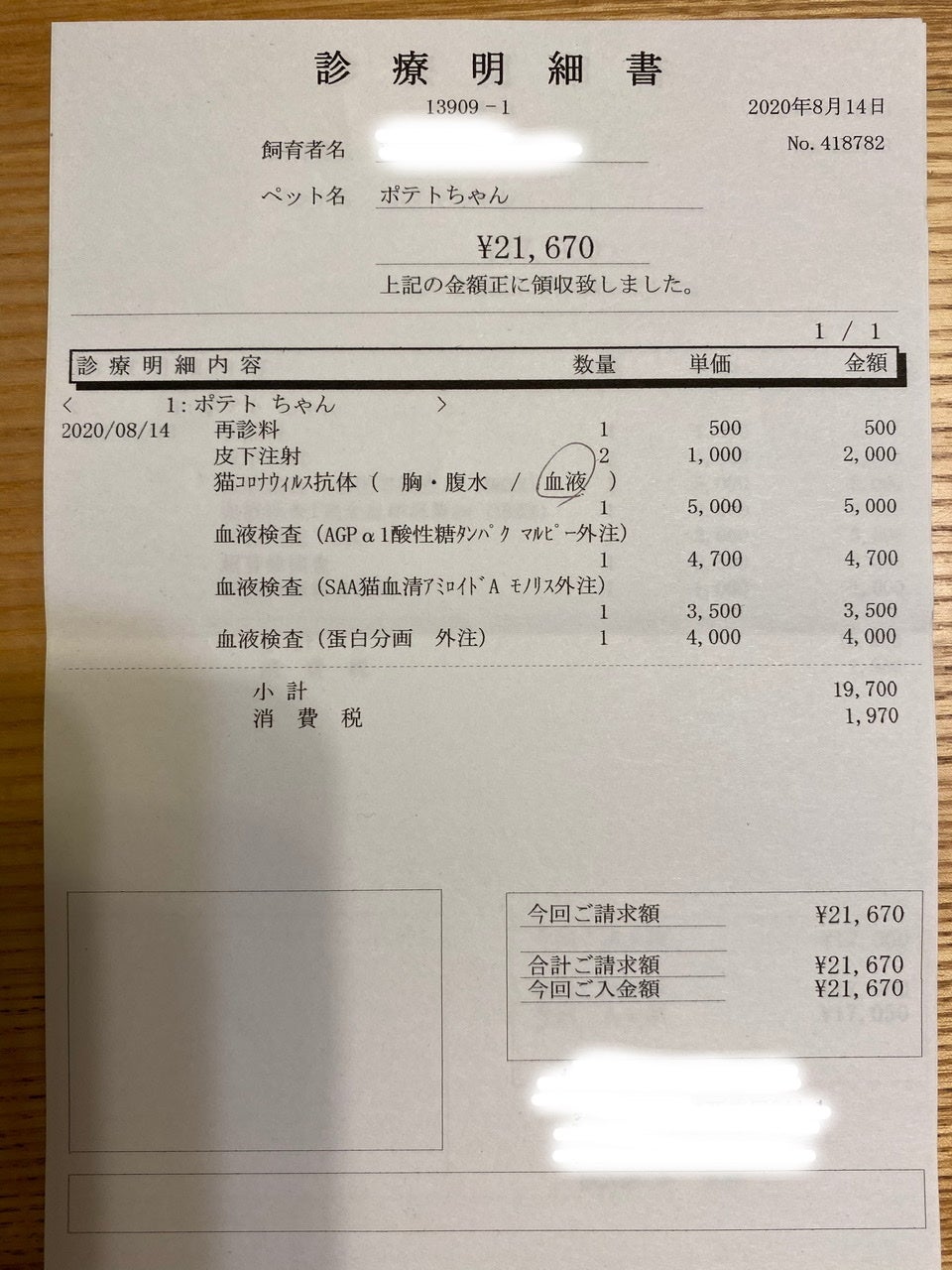注射2本、FIPか詳しく調べる為の採血する→結果は1週間後ぐらい