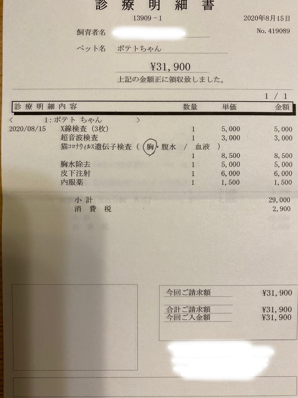 いつにも増して息苦しそうで病院へ駆け込んだ8月15日、13日に撮った肺のレントゲンよりさらに肺が白く、胸水が溜まっていて肺を圧迫し片方の肺だけで呼吸をしている危険な状態でした。