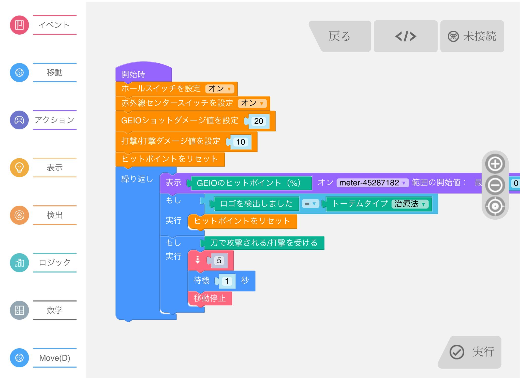 現在はGEIOというバトルロボットを使用して、2対2のバトルや宝探し、レスキューなどの競技を通じてScratchのようなビジュアルプログラミングツールを用いて、レギュレーションに沿ったプログラミングを話し合いながら制作し、違反が無いかチェックを受けた後で競技を実施するというトレーニングを行ないます。