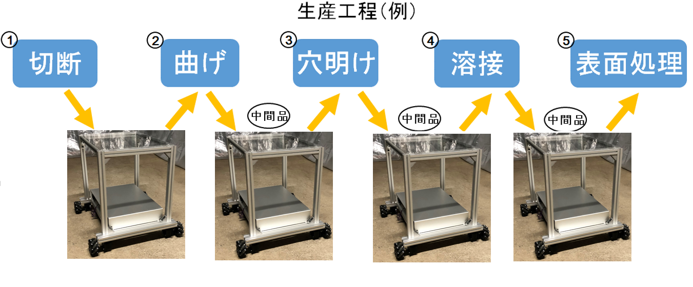 私の勤めている工場ではオフィス家具の製造を行っています、製品を完成にするまでいくつもの工程を部品、又は中間品になった状態で次工程に行きます。下図は椅子を製造する全体的な流れの例です。