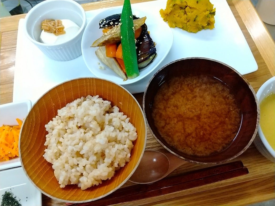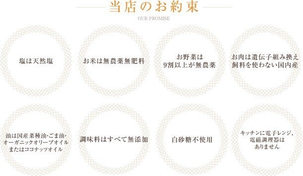 お約束=塩は天然塩、お米は無農薬無肥料、お野菜は9割以上が無農薬、調味料はすべて無添加、白砂糖不使用、オイルはなたね油・ごま油・ココナッツオイル・オリーブオイル、お肉は遺伝子組み換え飼料を使わない国内産、キッチンに電磁調理器・電子レンジはありません。