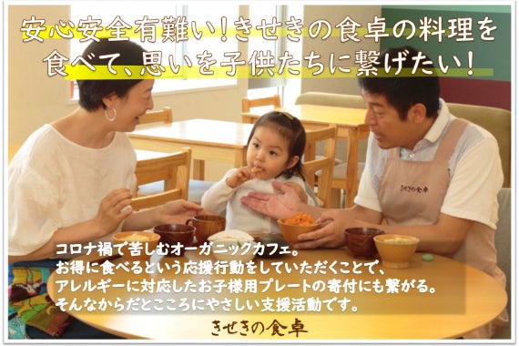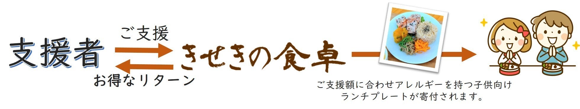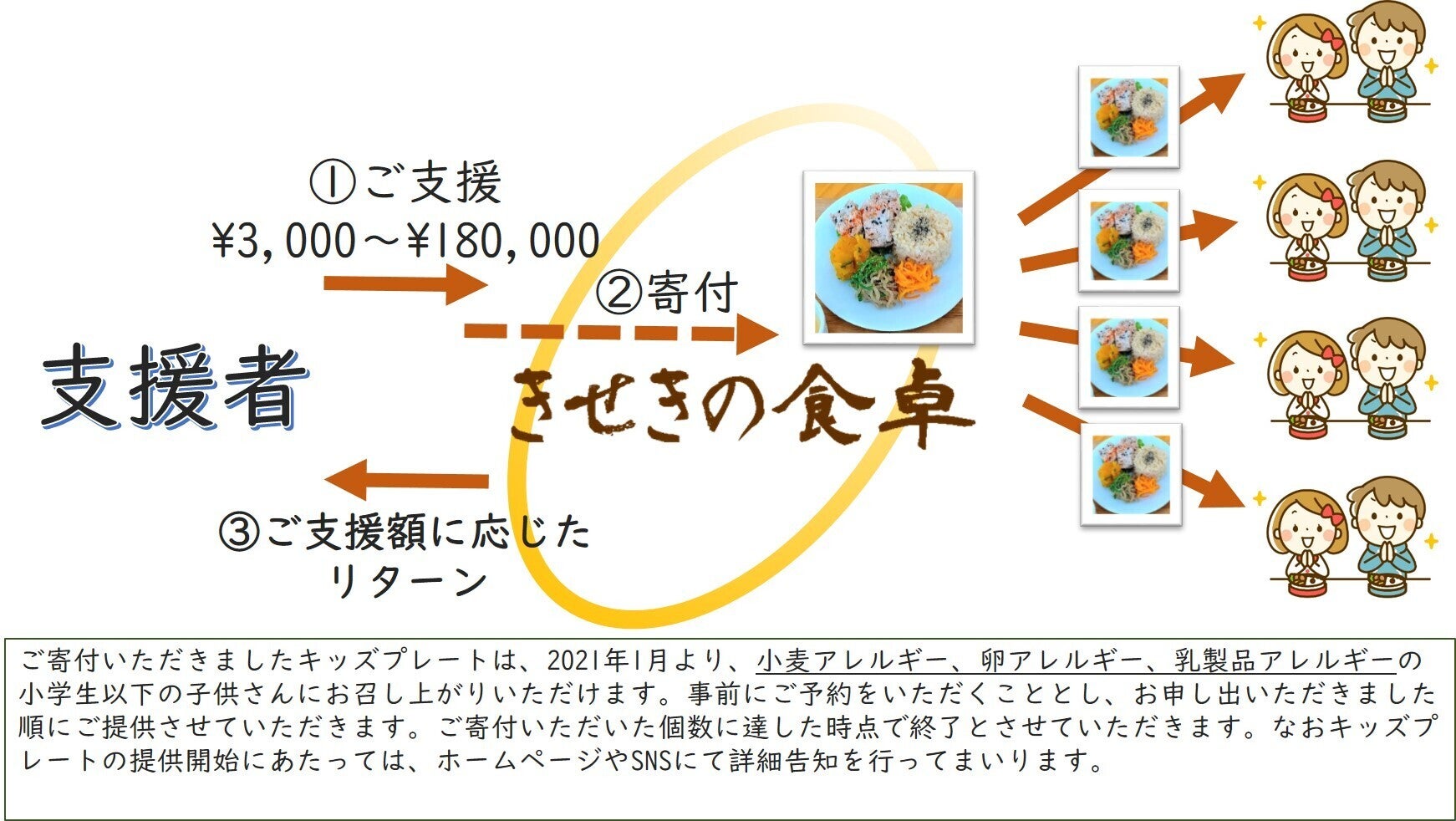 今回は、ご支援いただきました皆様へはお得にお召し上がりいただけるランチ券・ディナー券・食事券等リターンをお返しさせていただき、その一部をアレルギー対応(今回は、小麦・卵・乳製品対応に限定:対象は小学生以下)のキッズプレートとしてご寄付いただき、それをきせきの食卓が子供たちに届けるというものです。