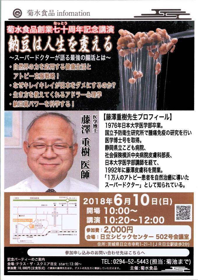 2021/07/03 17:13こんにちは!菊水食品の広報担当です。★★またまたテレビ出演!★★7/3(土) 21:50~22:20 NHK総合テレビで放送される「有田Pのジモ芸ニッポン」に菊池社長が出演します!茨城県の地元芸人のお笑い審査員としての出演。ぜひご覧ください!*再放送⇒7/16(木)深夜24:56~25:27https://twitter.com/nhk_aritap★★銀座で納豆作り体験はいかが?★★7月10日は 納豆の日!ということで、7月9日(金), 10日(土)の2日間、銀座のイバラキセンス(茨城県アンテナショップ)にて「納豆作り体験ワークショップ」を開催!!*7/10は満席でキャンセル待ち、7/9はまだ大丈夫です(7/3現在)。参加ご希望の方はイバラキセンスまでお早めにお申し込みください。【イベント概要】日程:7月9日(金),10日(土) 14:30~17:00 (14:00~会場受付)会場:IBARAKI sense 内レストラン BARA dining(東京都中央区銀座1-2-1)参加費:お一人様1,500円(税込)参加者年齢:5歳以上(小学生以下は保護者同伴)持ち物:特になし(汚れても良い服装でお越しください。必要であればエプロンなど)予約受付期間:7月5日(月) 17:00まで〈予約受付方法〉メール(info@ibaraki-sense.com)または、店頭にてお申し込み用紙への記入メールでの必要記入事項:?参加希望日?参加人数(1グループ最大4名様まで)?参加者氏名・年齢・代表者TEL※予約受付完了のおしらせは、お電話(03-5524-0818)またはメールにてご連絡いたします。〈注意事項〉※イベント開催時メディア等の撮影がある可能性がございます。予めご了承ください。※当日キャンセルの場合は参加費用のみお支払いいただきます。※マスク着用でのご参加をお願いいたします。講師として納豆職人 菊池啓司が参加し、皆さまに納豆作りを伝授します!納豆を自分で作るという機会はなかなかないと思います。この機会にぜひチャレンジしてみてはいかがでしょうか!!他にも、質問したい!菊池社長と話してみたい!という方は、毎週月曜日20:00~22:00、Clubhouseの「納豆部屋」にお越しください!!納豆に関する情報や菊水食品について知ることができます。さらに、Twitterで #納豆部屋 をつけて投稿していただくと、質問にお答えしますので、ぜひ!!【ねばねばコラム #7:納豆の日】7/10は納豆の日!誰が想像してもわかるように7月(なっ)10日(とう)という語呂から来ています。実は!納豆の日は、最初は全国的なものではなく、関西限定の記念日だったのです。「関西納豆工業協同組合」が関西の納豆の消費拡大のため、昭和56年に関西地域限定の記念日として定めました。それを「全国納豆共同組合連合会」が平成4年に改めて「納豆の日」と定めたことで全国的な記念日になったのです…!納豆の日にちなんで、菊水食品でも毎年企画を実施!昨年は「いばらき農家の納豆 わらつと」を発売しました!!そして今年の「納豆の日」は…「開運納豆」新発売!!Clubhouse「開運 北原照久Teru’sBar」主催の北原照久先生プロデュースによる「開運納豆」の販売を納豆の日に合わせて開始いたします。10個セットご注文の先着100名様に、1.北原照久氏のサイン入り「ツキの10ヵ条」2.納豆の甘さを引き立てる「藻塩」をプレゼントいたします!なんと先行販売受付中!ぜひご予約ください。【予約販売】北原照久プロデュース 開運納豆 10個セット 〈2大特典付き 100セット限定〉 - 茨城県日立市 納豆のおみせ 菊水食品 kikusuigold.com もっと見る