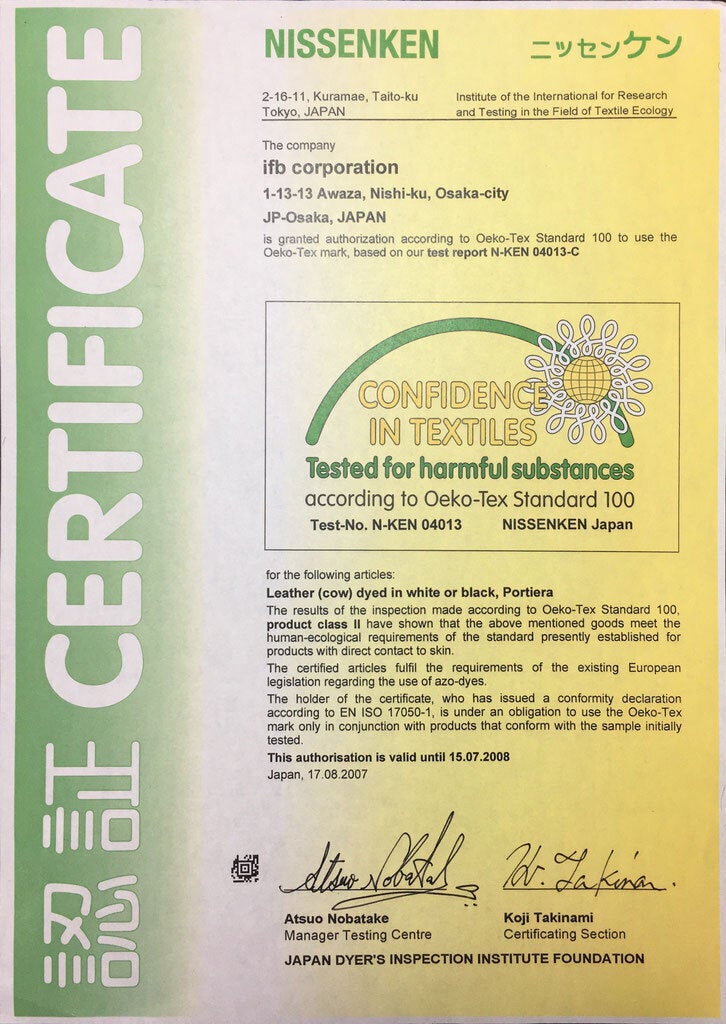▲タツノラボのノンクロムレザー「ポルティラ」は、世界トップレベルの安全な繊維製品の証“エコテックススタンダード100”を取得。350を超える有害化学物質が対象となる厳しい分析試験にクリアした製品だけに与えられる世界最高水準の安全規格です。