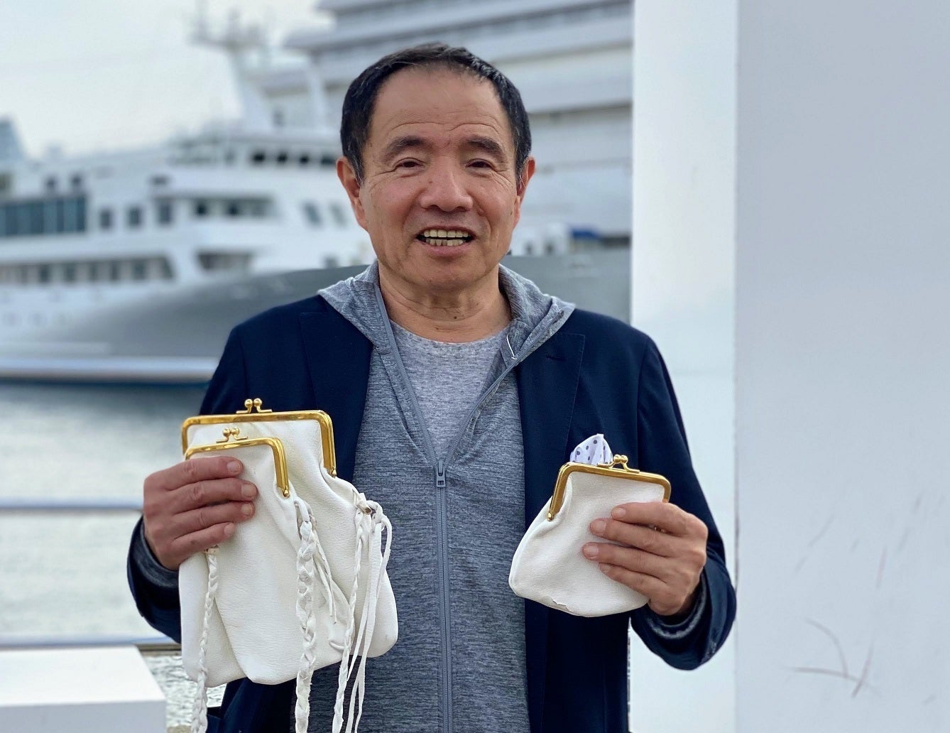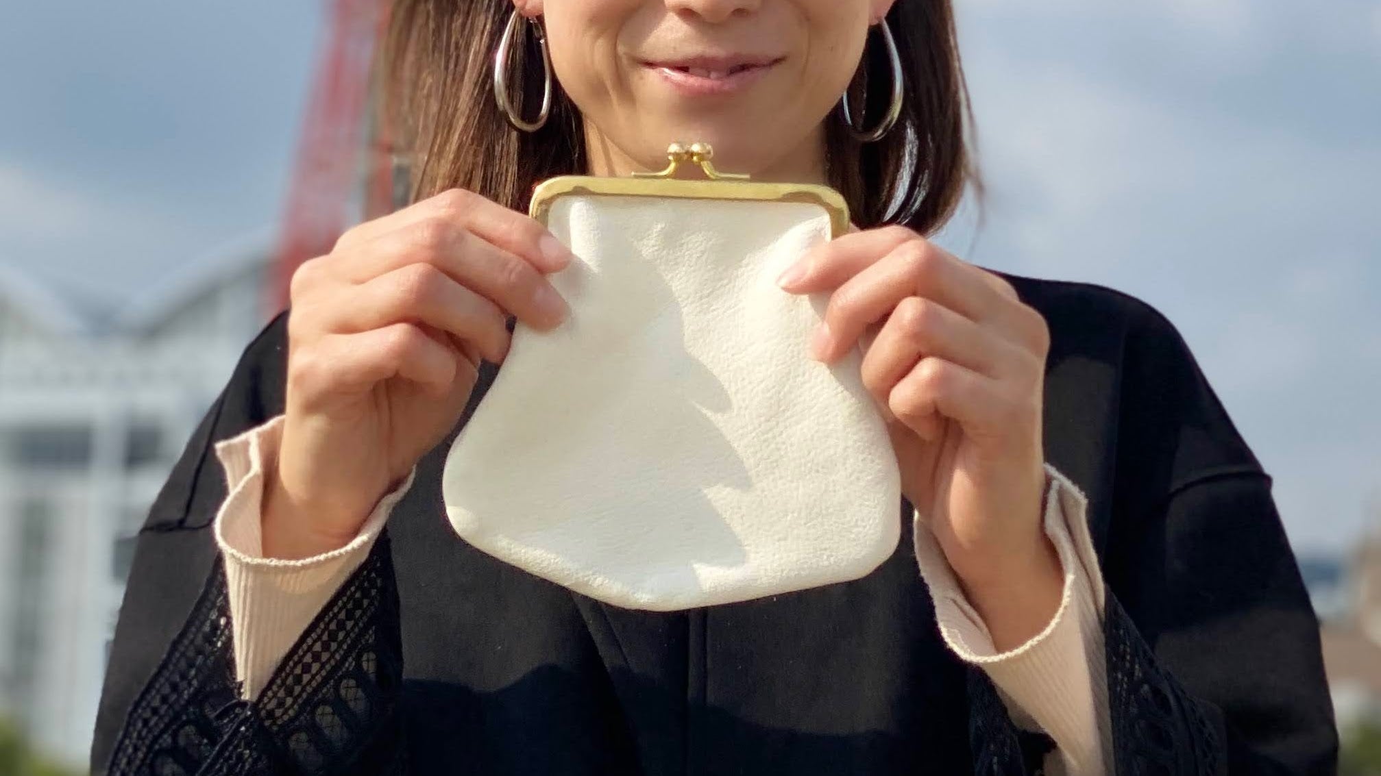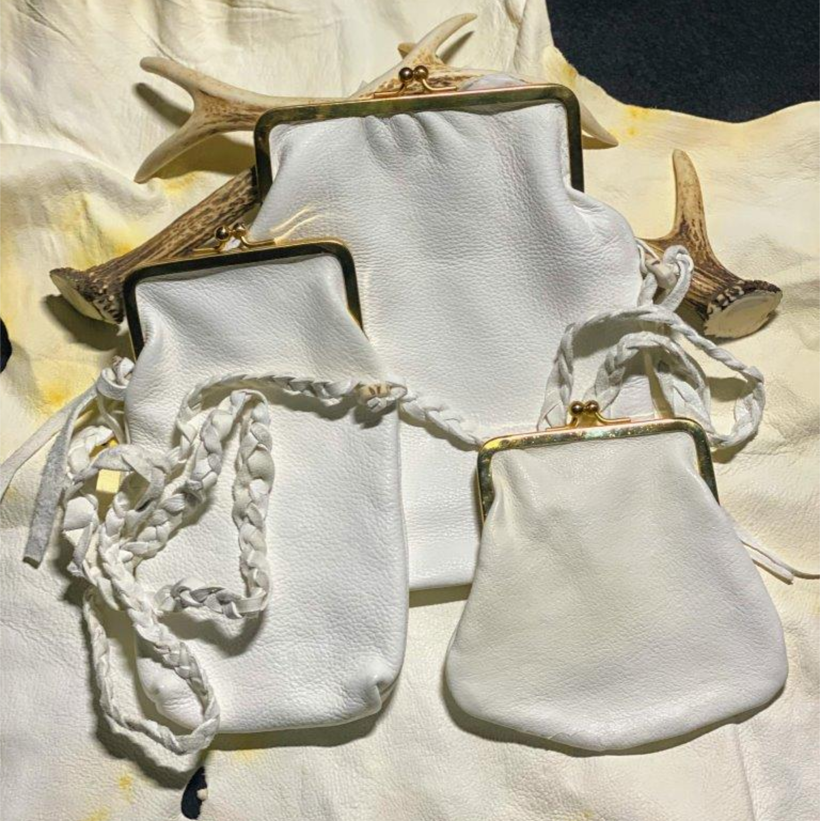 奇跡の白い鹿革「ポルティラレザー」を使い、今回製作したのはがまぐちのポシェット2種類と財布1種類。