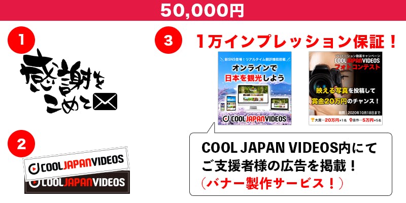 ③「COOL JAPAN VIDEOS」内の広告枠にてご支援者様のサービスを広告掲載させていただき、「COOL JAPAN VIDEOS」内のご支援者様のアカウントページ、もしくはご支援者様のホームページへリンクさせていただきます。