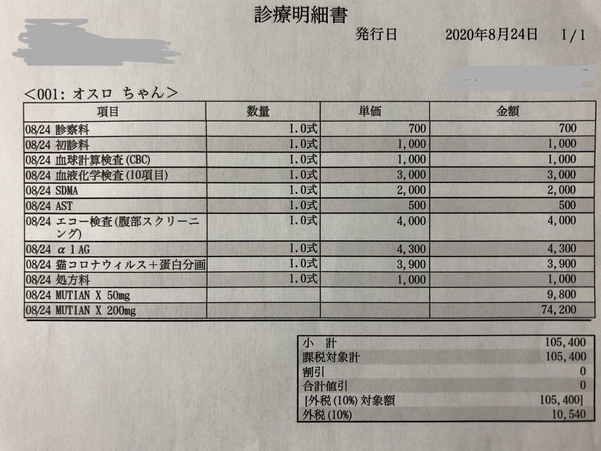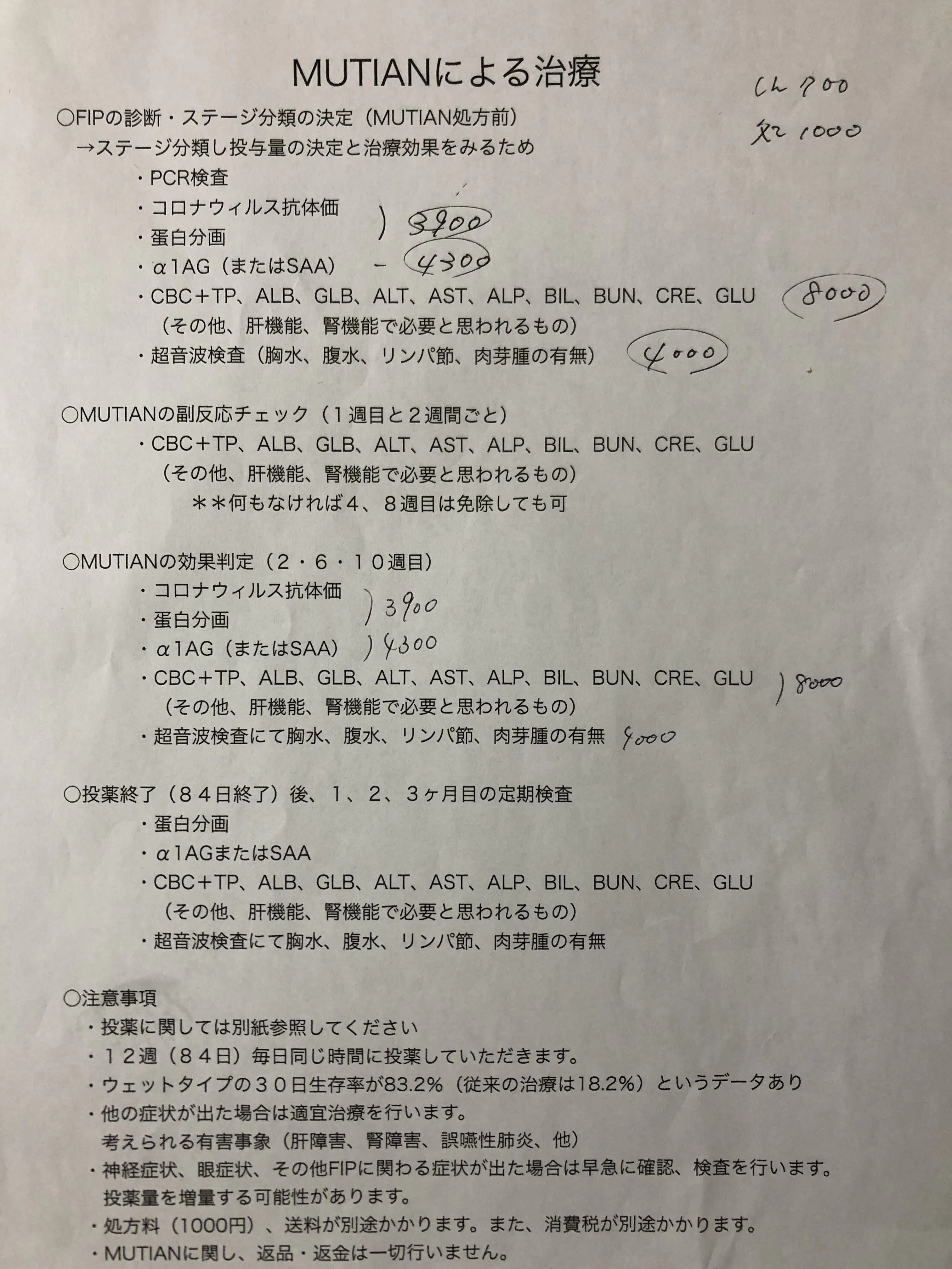 診断結果はFIP ドライタイプ 中期でした。ドライタイプは確定診断が難しい場合があり、FIP検査結果が陰性でもFIP症状があり、FIPの治療薬を飲むと効きやはりFIPだったと断定できる場合もあるそうです。