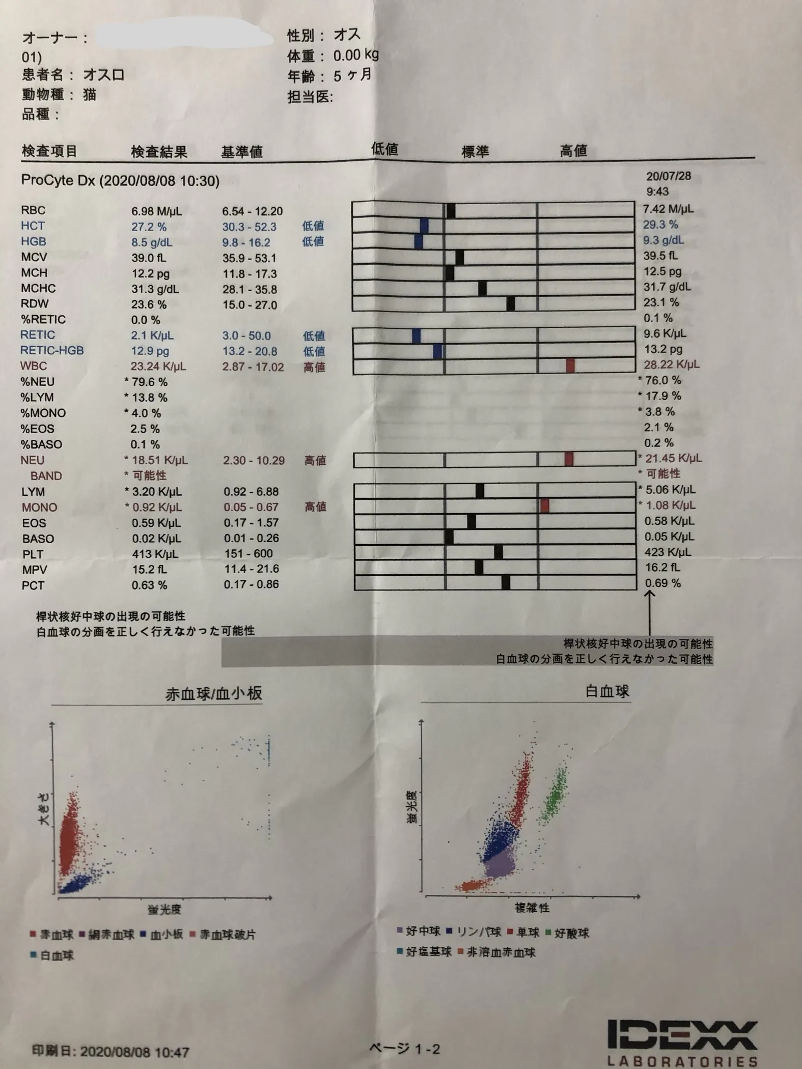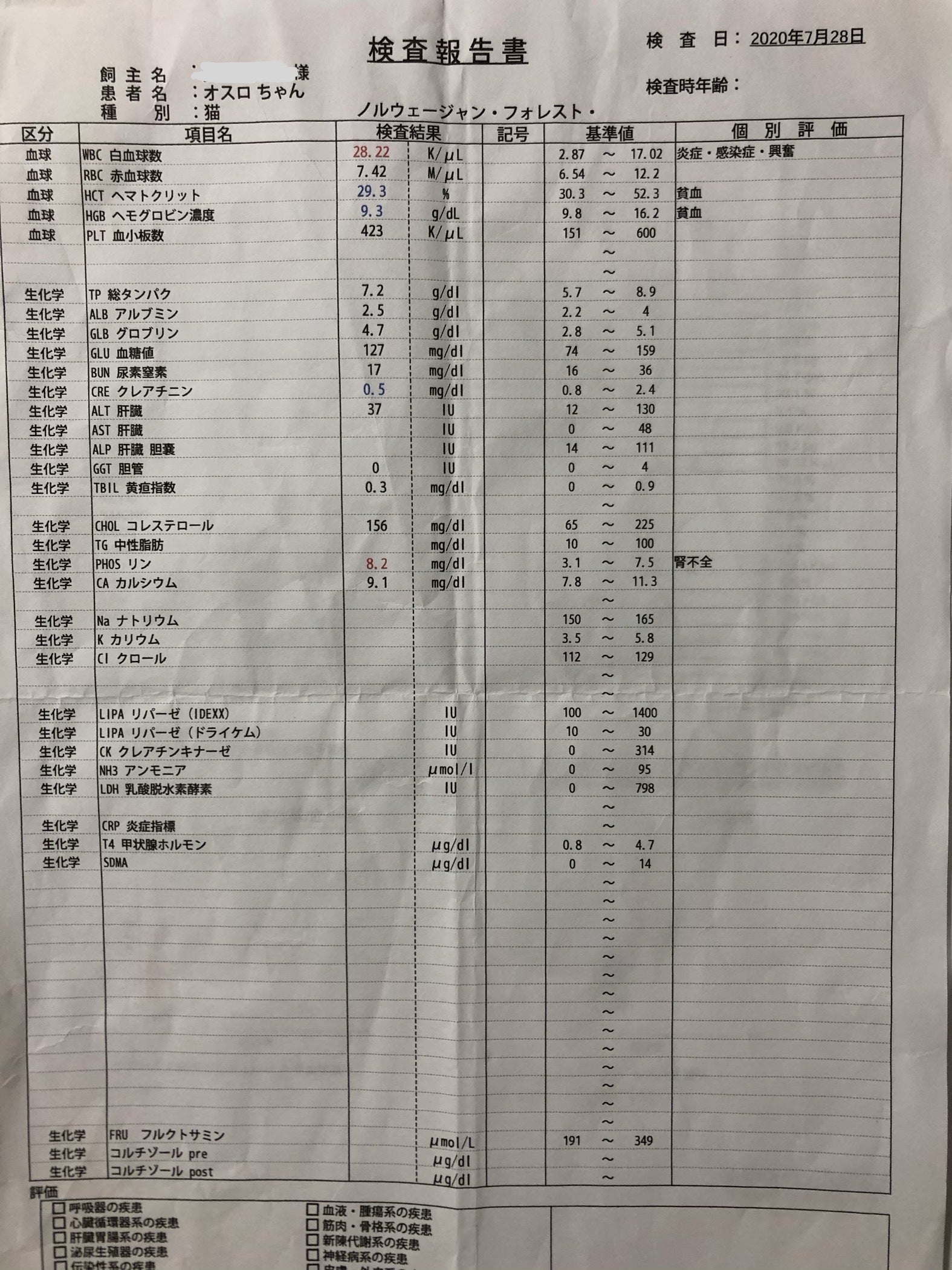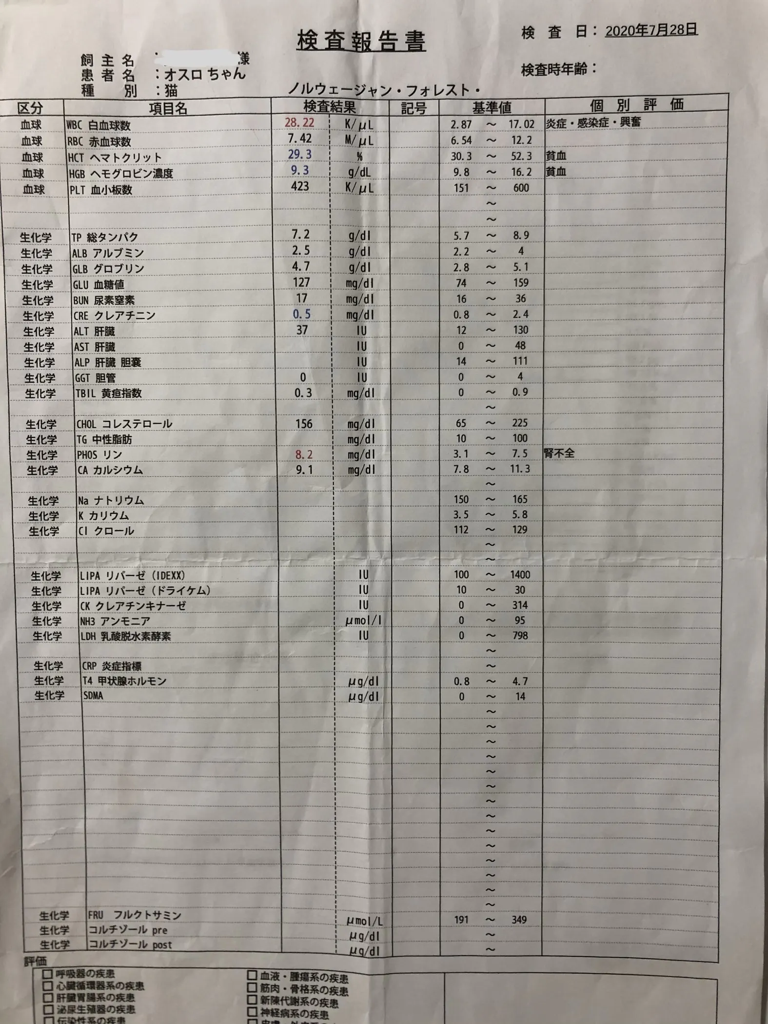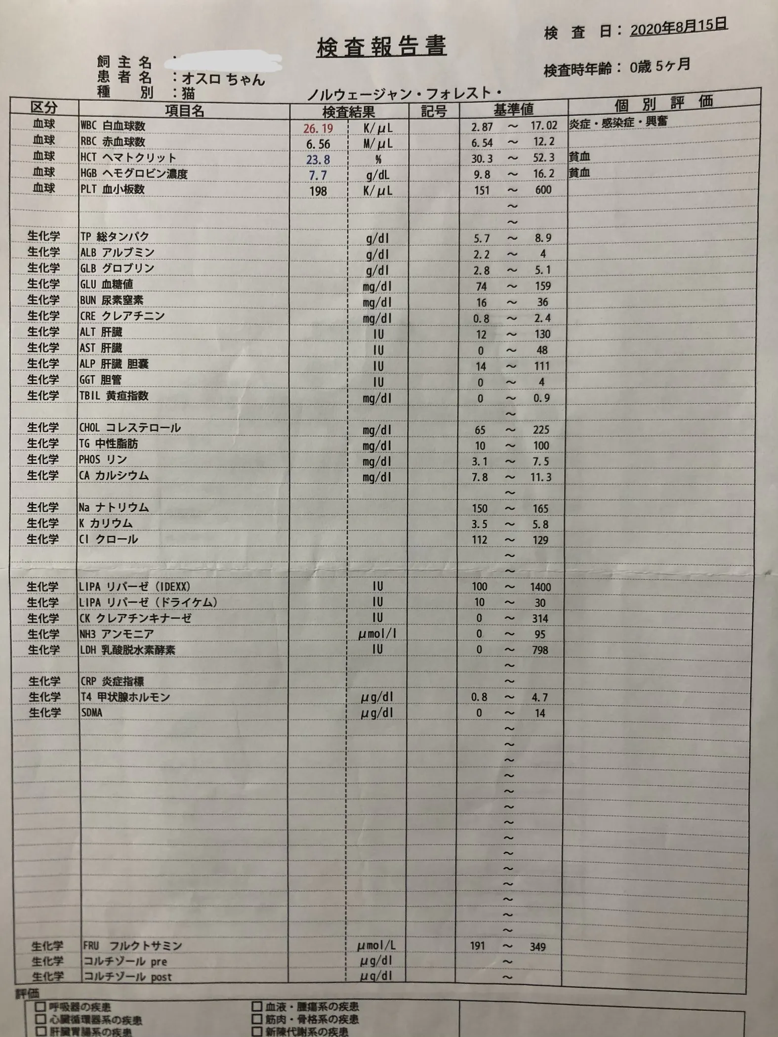 ↑白血球が多く(炎症が起こっている)、貧血。さらに39.8℃と高熱でした。腎に関して子猫なのでこの数値に問題はないとのことでした。