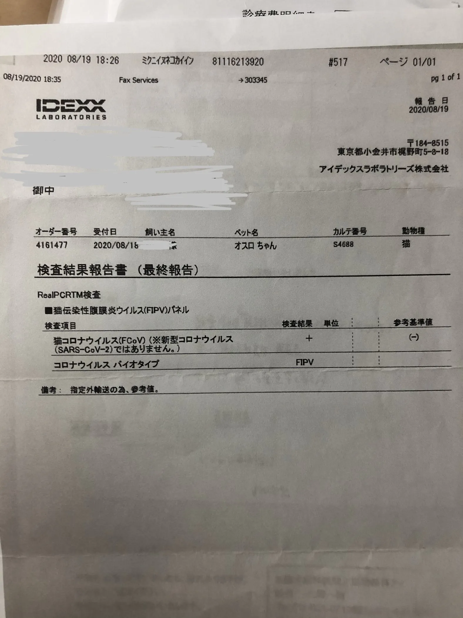 その間もしFIPだったどうしよう、と不安で不安でたまりませんでした。病院から電話が来るのが本当に怖かったです。