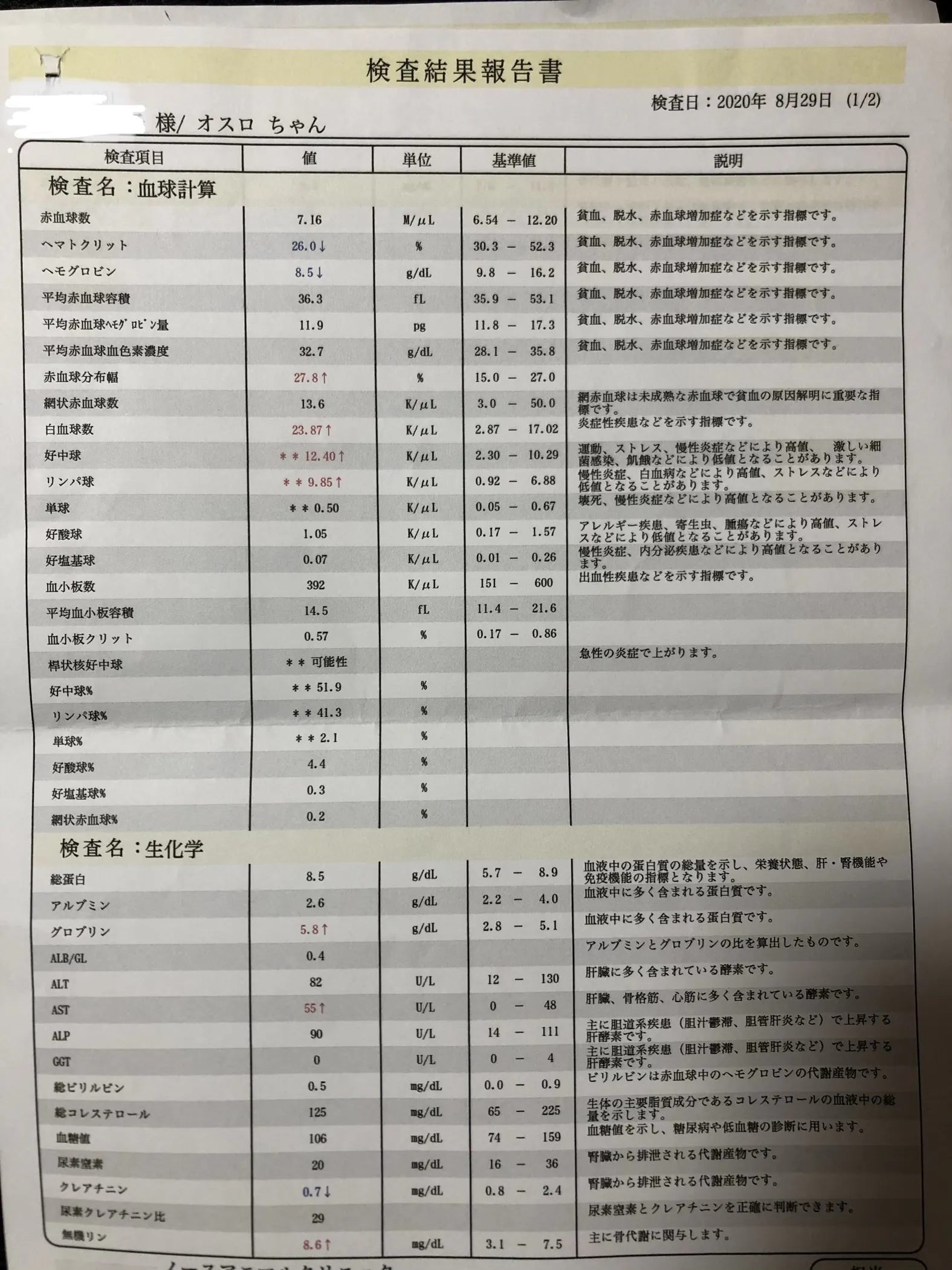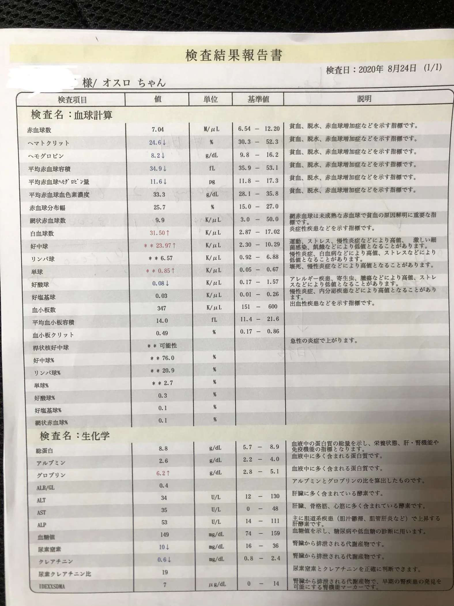 炎症は治まっておらず、貧血も続いている様子でした。肺炎は落ち着いているにも関わらず、先生も何故かわからないとのことで、これが続くようであれば大学病院にいって精密検査をしたほうがいいとのことでした。消炎剤を追加し経過を観察することに。