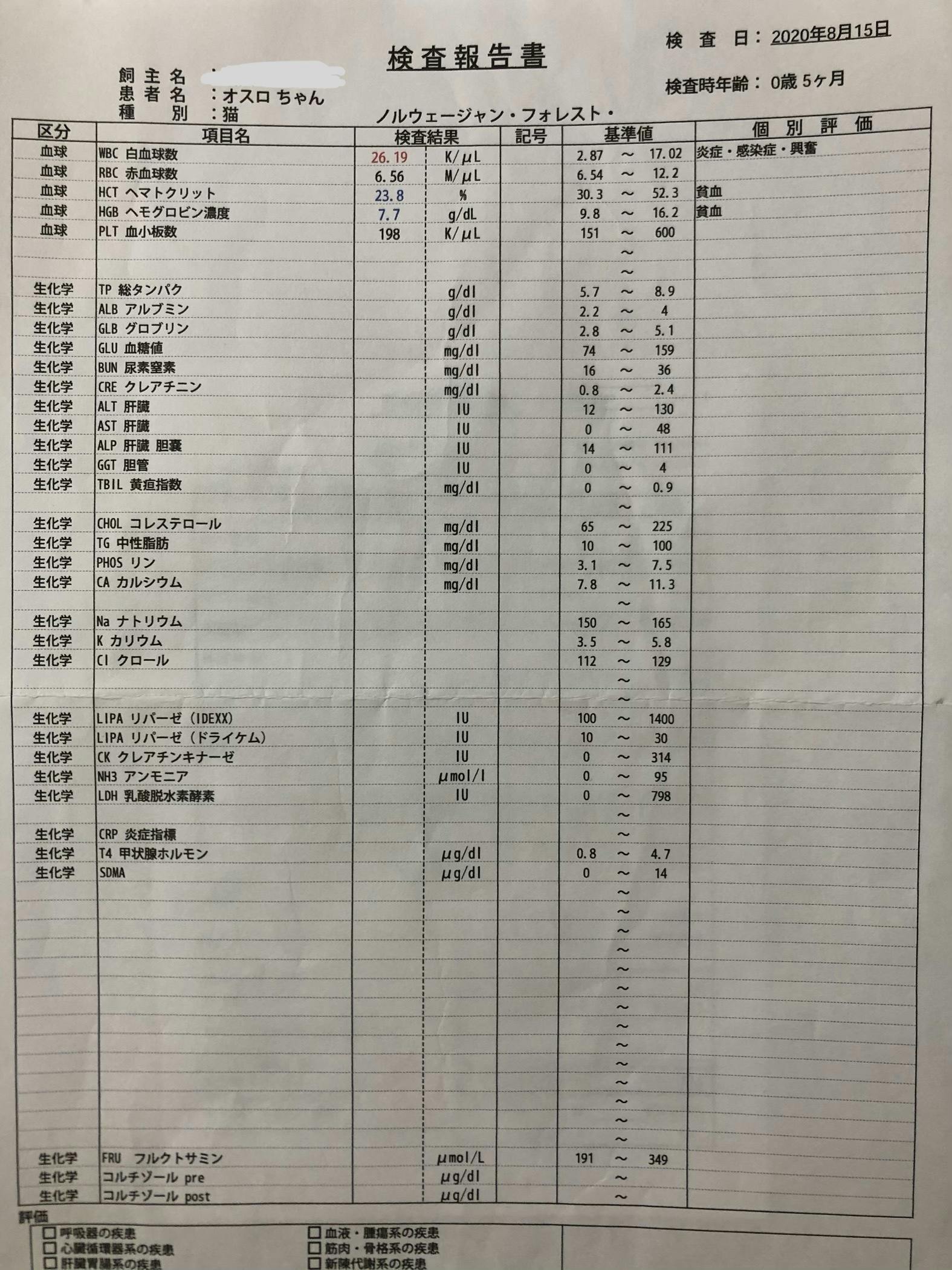 ↑白血球が多く(炎症が起こっている)、貧血。さらに39.8℃と高熱でした。腎に関して子猫なのでこの数値に問題はないとのことでした。