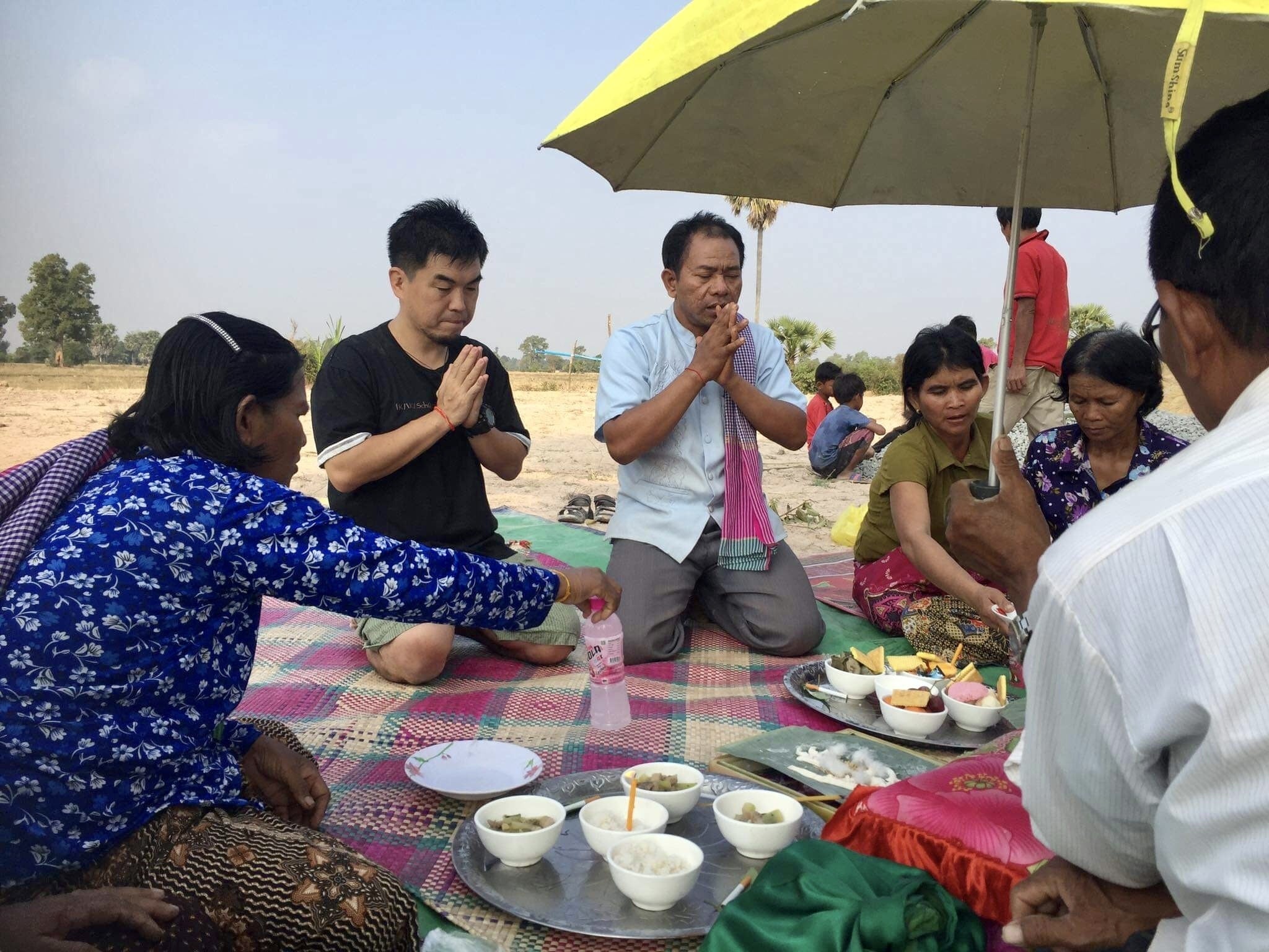 チョムリアップスォ!代表の加藤大地(かで)です。SDGsエコビレッジ建設の土地の地鎮祭を行いました。地鎮祭とは、『土木工事や建築などで工事を始める前に行う、その土地の守護神を祀り、土地を利用させてもらうことの許しを得る。これには神式と仏式がある。一般には神を祀って工事の無事を祈る儀式と認識されており、安全祈願祭と呼ばれることもある。』そうです。地鎮祭には村長さん夫婦、弊社スタッフ、村の中で近くに住む人たちなどが集まってくれ一緒にお祈りをしました。カンボジアの天女をイメージしたものや、数々のお供物一通りのお祈りをしたあと、土地に埋めます埋めた場所に水をかけ、その上に飾りをおきます人には日本でいうところの御守りとして赤い紐が手首に巻かれ地鎮祭終了これで安心して進めていけます!あとは今回のクラウドファンディングを通して、より多くの方々と繋がり建設資金があつまればカンボジア初となるSDGsエコビレッジが形になり、そこには多くの笑顔が溢れる姿が想像出来ます♪僕に出来る事は現地でしっかり動きつつ、発信していく事だと思っているので、引き続き応援の程よろしくお願いします。Kisso 加藤大地