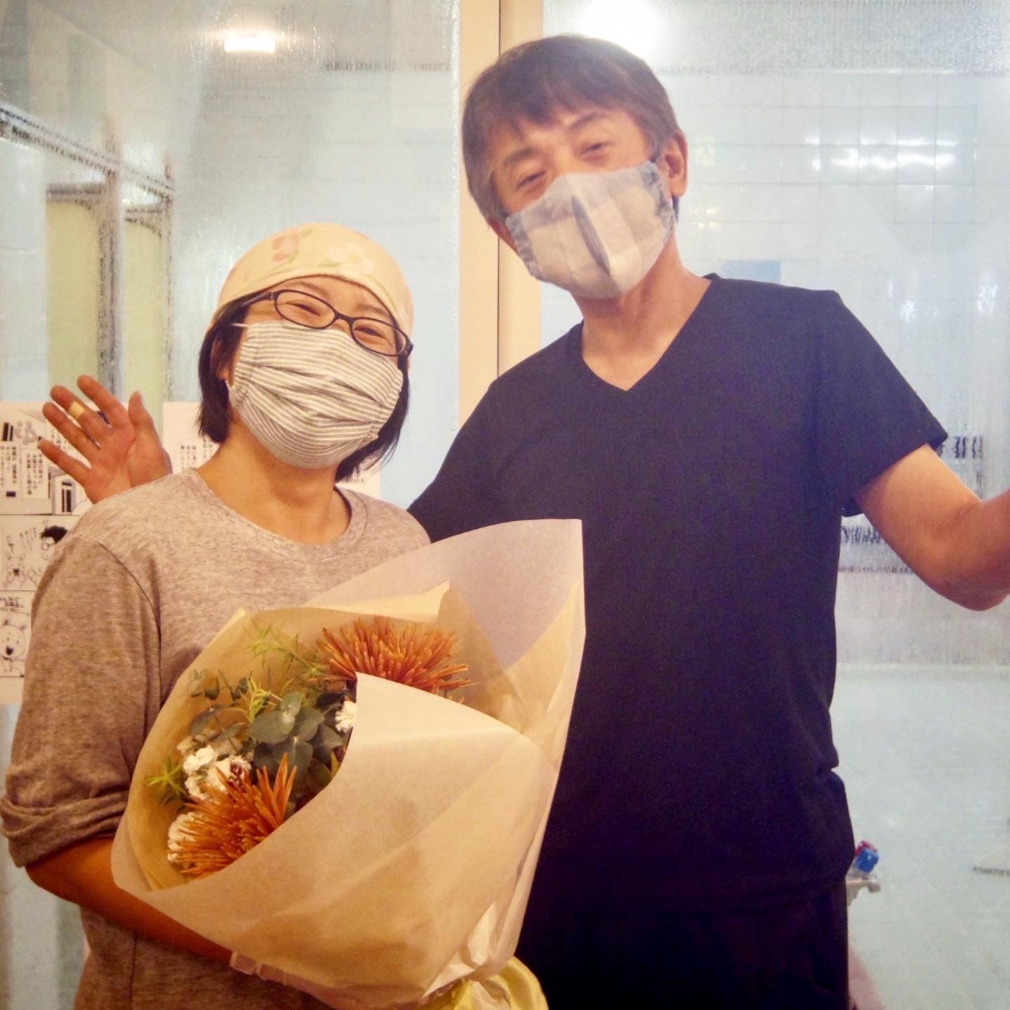 先月 9.29[火]は、前オーナー、宮坂賢吾さんが営む〈菊の湯〉としての最終営業日でした。もちろん僕も店を閉めたあとに訪れて、閉業時刻の直前まで、しっかりその湯を堪能しました。最後の最後まで普段どおりに、ひとつひとつの仕事を納めていく宮坂さんご夫妻。営業終了後、この先この銭湯を引継ぐ〈栞日〉を代表して、僕と湯屋チーフの「ひかるん」こと山本ひかるから花束を贈ったところ、この笑顔をカメラに向けてくださいました。いつも柔和で朗らかな宮坂さんご夫妻あっての、今回の事業継承。本当に幸運な巡り合わせとしか、言いようがありません。翌日以降も「ここは自分たちがやっておくから」と、おふたり揃って浴場にいらして、高圧洗浄機で天井の汚れを落としたり、タイルの目地を補修したり、浴槽を念入りに掃除したり、「いましかできないから」と、ボイラー室も細部までチェックしてくださっています。そして、これまでと変わらず、これからの〈菊の湯〉の姿について、寄り添って一緒に考え、知恵を絞ってくださり、「リニューアルオープンしたあとも、安定して通常運転できるようになるところまでは、一緒に湯も沸かすし、なにか設備のトラブルが起きたら呼んでもらえたらすぐ対処するから」と仰ってくださっているのですから、これほど心強い伴走者はほかにいません。「もともと閉業するはずだった事業ですから。何をしても『失敗』なんてことはありません。おもいっきりやってください」。〈菊の湯〉を継承することが決まったそのときから、宮坂さんが一貫して僕に伝えてくださっていることです。だからこそ、僕はもう、ただ目の前の課題ひとつひとつに、全力で取り組むだけなのです。そして、漫画家の顔も持つ奥さまの宏美さんは、今回の事業継承について、常連さんにわかりやすく伝えるために、こんな漫画を描き下ろして、ロビーや脱衣所に貼り出してくださっていました。さらに、最終営業日には、その日のためだけに、こんなポスターまで。〈菊の湯〉を継承してから、気づけばあっという間に10日間も経ってしまい、こちらでの活動報告が何もできずにおりましたが、前オーナー夫妻からのたくさんの愛に包まれて、僕らは日々、一歩ずつ前に進んでいます。賢吾さん、宏美さん、いつも、本当に、ありがとうございます!!---そして、このポスターにもあるとおり、来週 10.15[木]14:00 のリニューアルオープンに向けて、施設のリノベーションは、既に佳境を迎えつつあります。次の活動報告では、この10日間の改修工事の様子をお伝えします。