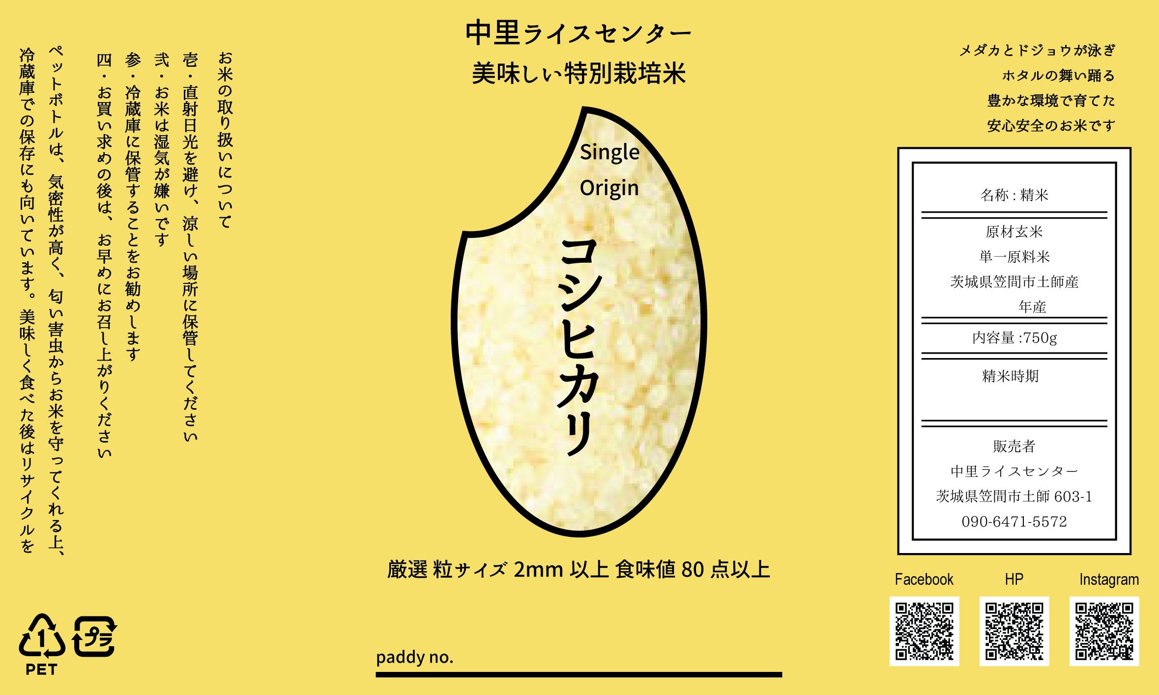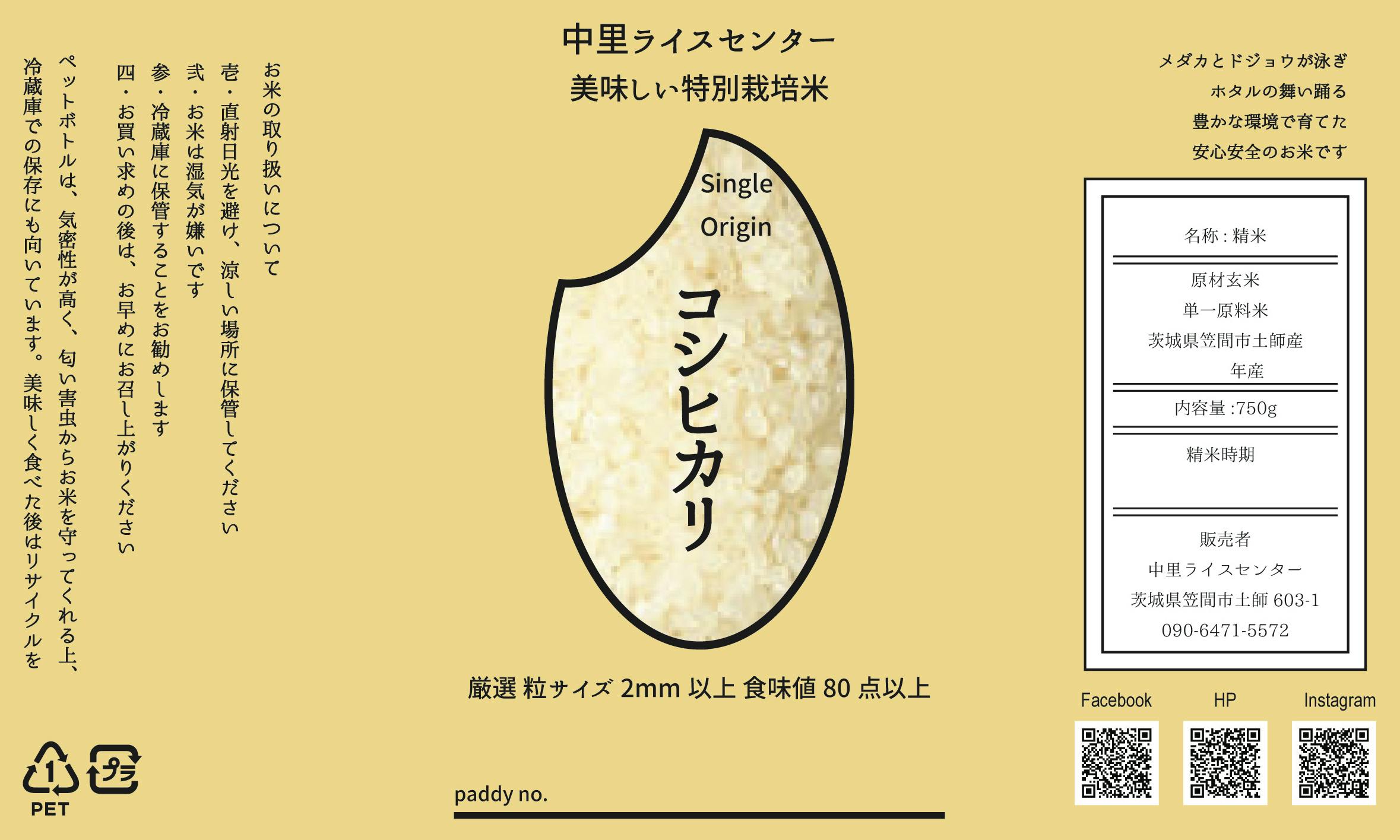 シンプルでかつ、分かりやすく、米粒の大きさのアピールとともに、シングルオリジンの栽培田んぼの番地を一番下に手書きで記入出来るように。