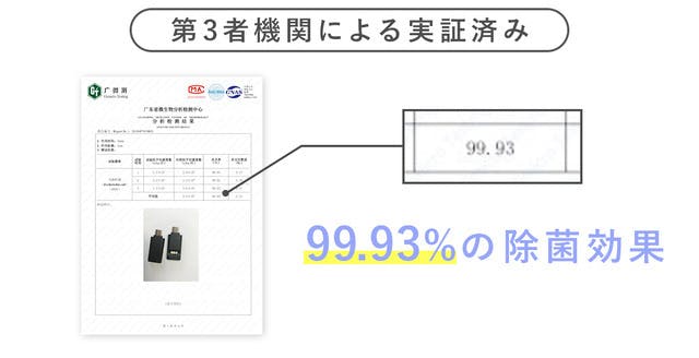 また「UVマルチ除菌器 UV+」に使われているUVライトの除菌効果は、第三者機関にて実証検査済みです。