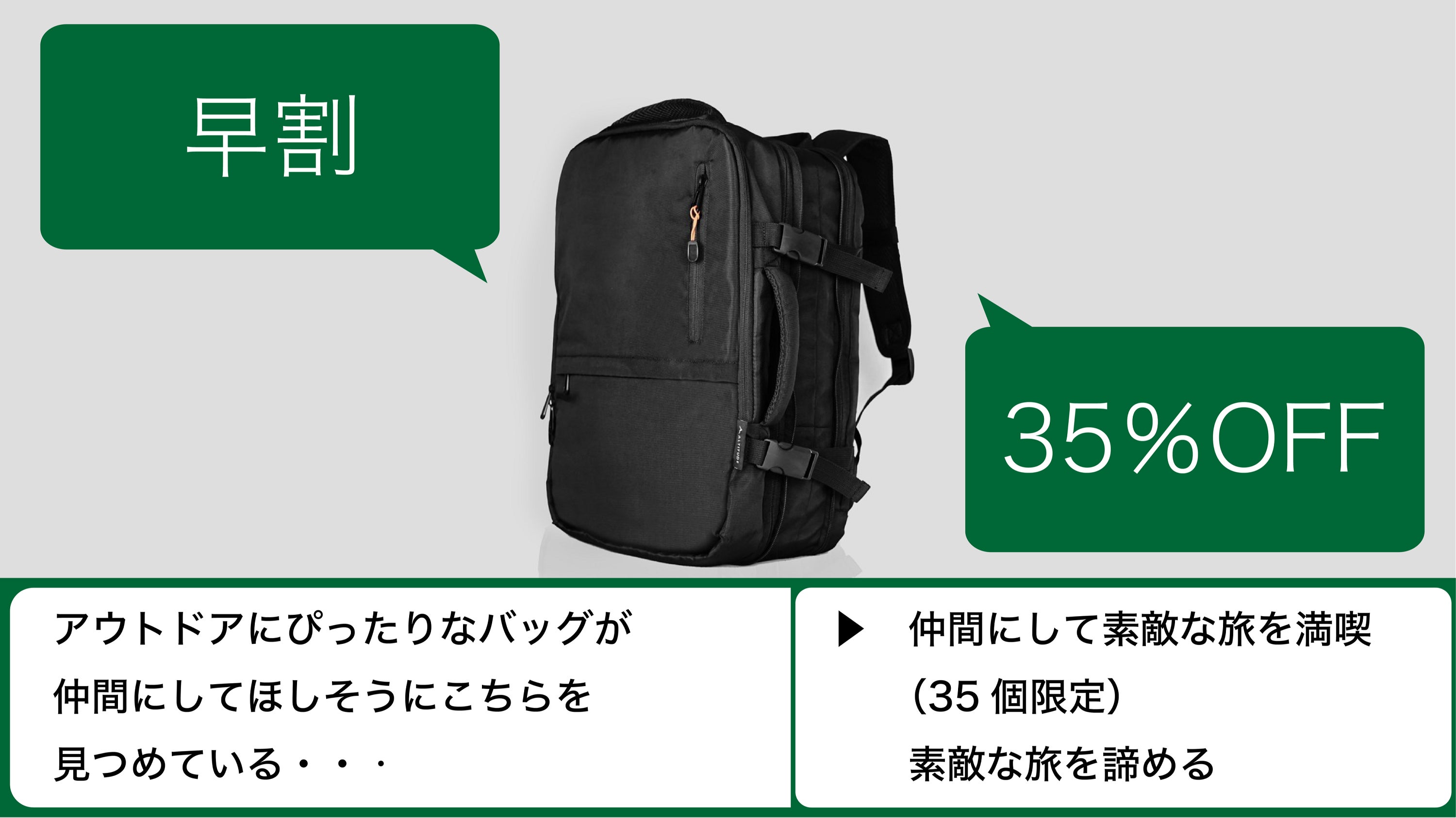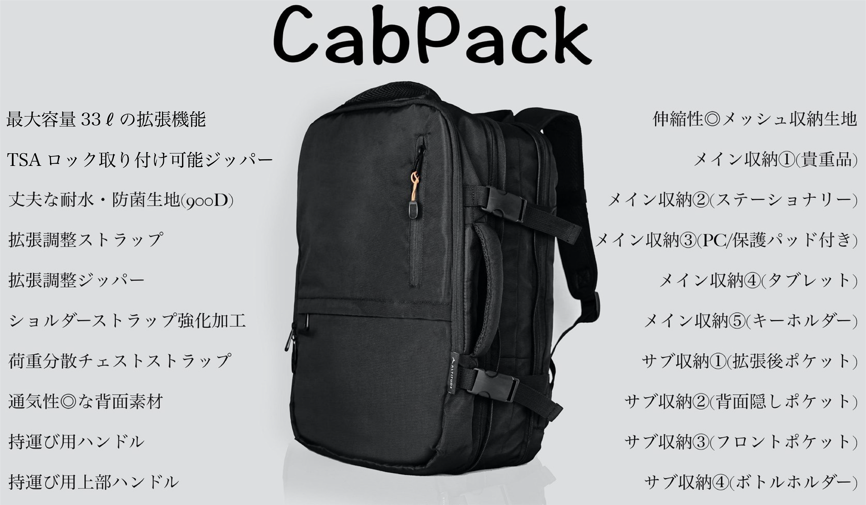 ”我々のチームは皆、旅が好きで、旅をライフワークとしています。日本は私たちの母国であるオーストラリアと同じ島国です。 陸続きの国とは異なり、旅に出る時には飛行機の大きな移動が伴います。我々はその飛行機での移動をいかに快適にするか?を考え、このCabPackを作りました。収納や、素材選びにこだわり、ビジネストラベルからアウトドアまで対応可能なバックパックを作り上げました。是非CabPackを背負って快適な日々を過ごしてください!オーストラリアでお待ちしています。”