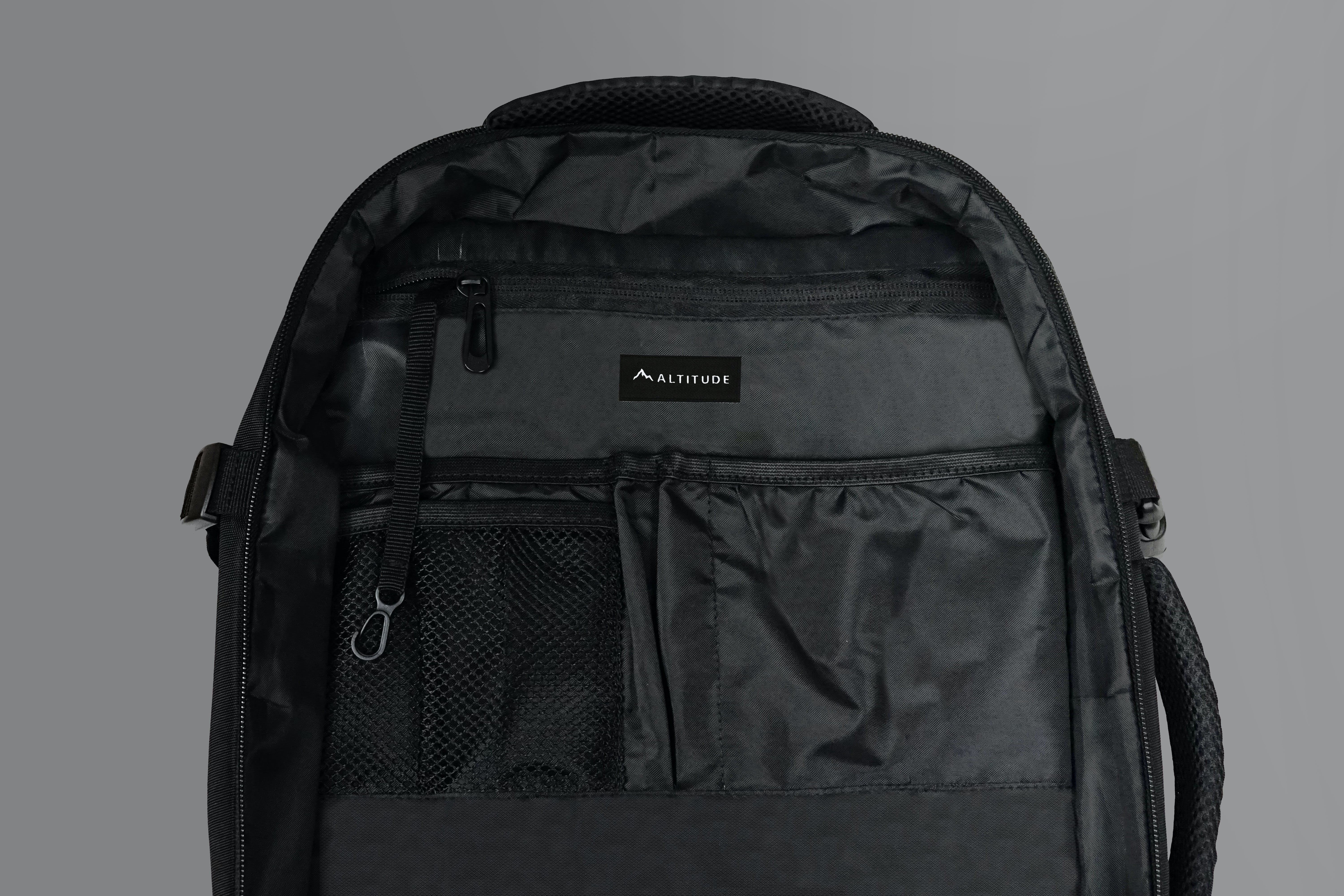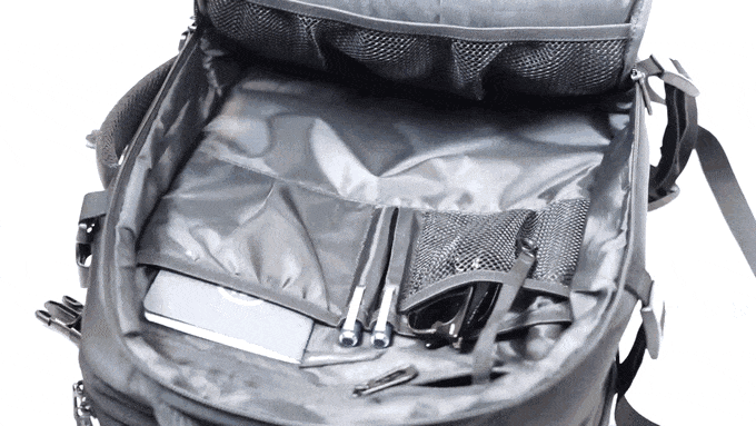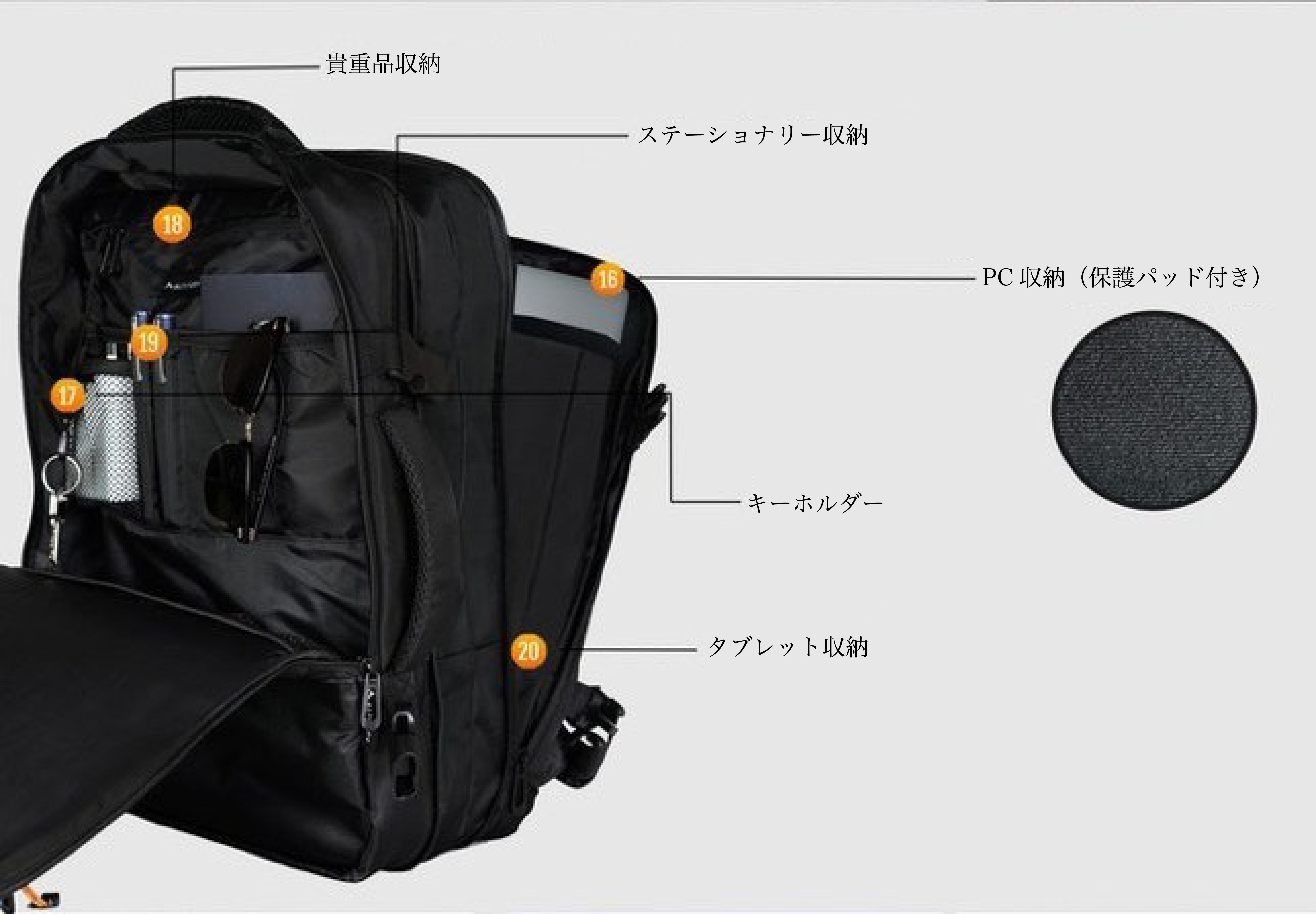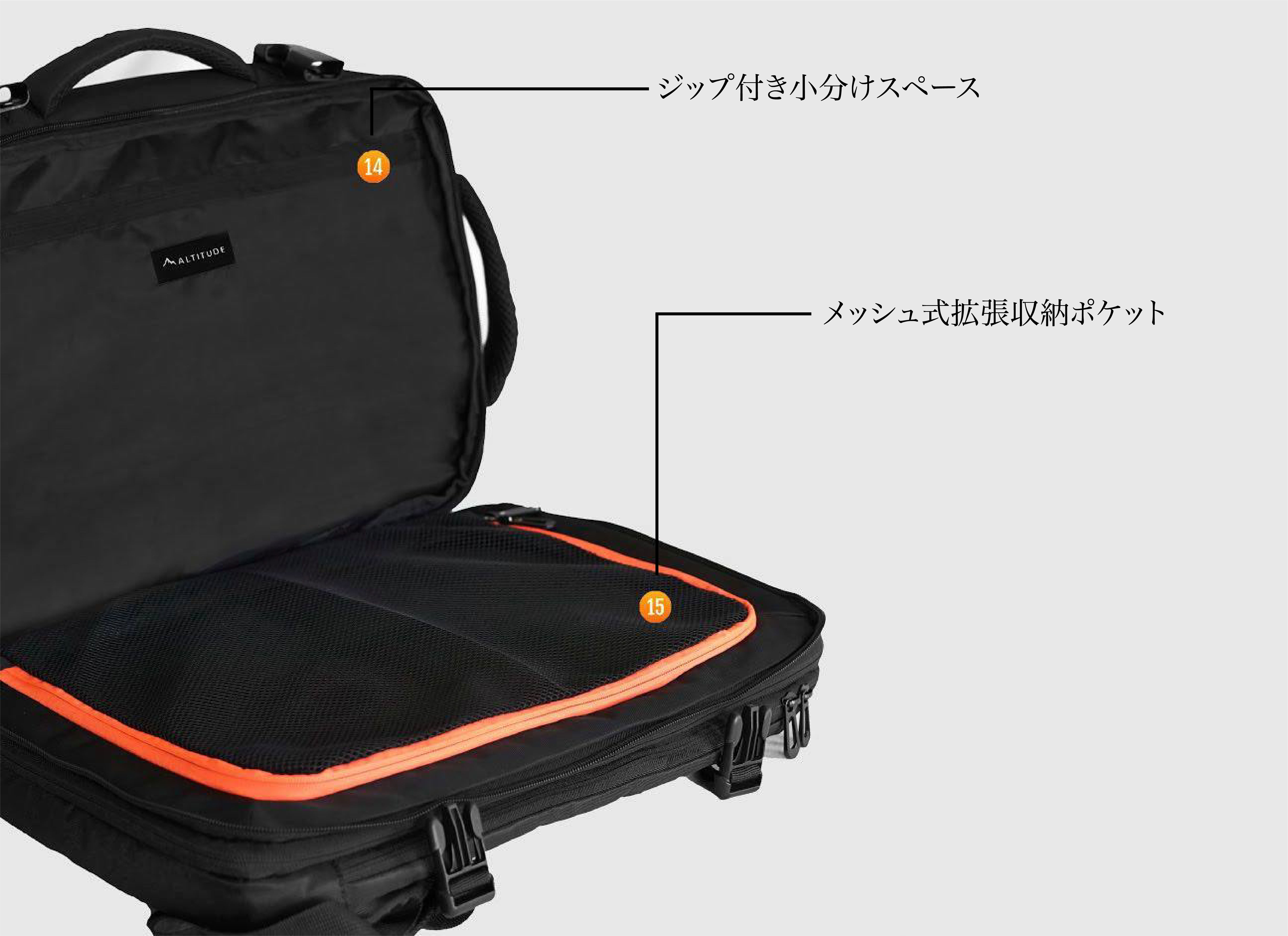 メインポケットからサブポケットまで、大小合わせて15個のポケットが付属。PCからカメラ、書類や小物類まで必要なものをあるべきところに収納可能。