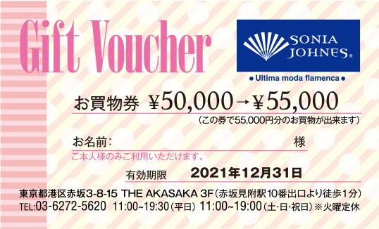 系列会社「ソニアジョーンズ」にてお使いいただけるお買物券です。選れたデザイン性に定評のある、「ソニアジョーンズ」にて衣装をご購入の方に5,000円オトクになります!