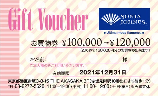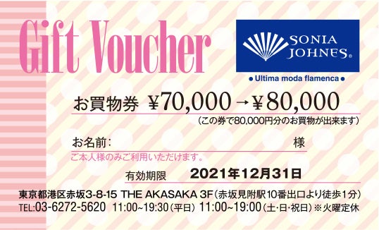 系列会社「ソニアジョーンズ」にてお使いいただけるお買物券です。選れたデザイン性に定評のある、「ソニアジョーンズ」にて衣装をご購入の方に20,000円オトクになります!