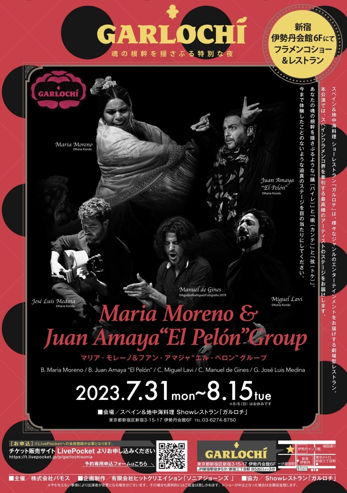 2023/07/24 10:46暑い日が続いておりますが、皆様いかがお過ごしでしょうか?おかげさまで、ガルロチは再始動をしてから、5組目のグループを迎えることとなりました。この、クラウドファンディングが大きな力になり、年に3組のペースで、続けることができております。これからも、皆さんとともに、フラメンコの感動を分かち合うことができたら幸いです。 この場を借りて、改めて感謝申し上げるとともに、今後ともご支援の程、どうぞよろしくお願い申し上げます。いよいよ、7/31(月)~、ガルロチでは、“マリア・モレーノ&エル・ペロングループ”が来日、熱い熱いフラメンコをお届けします!!7/30(日)までは先行割引にて、1,000円引きの価格でご予約いただけます。是非、ご予約お待ちしております!★María Moreno&Juan Amaya “El Pelón” group今年のフェスティバル・デ・ヘレスにて、作品“O../O../.O/O./O. (soleá)”を上演し、大好評を博した“マリア・モレーノ”と、2017年のガルロチ出演で日本のファンを虜にしたフアン・アマジャ“エル・ペロン”が再びタッグを組んで登場!バックミュージシャンも、スペインの第一線で活躍のアーティストが揃って来日!どうぞお楽しみに!【出演期間】2023年7月31日(月)〜8月15日(火)【出演者】B.María Moreno B.Juan Ameaya El PelónC.Miguel Lavi C.Manuel de Gines G.José Luis Medina【場所】Show レストランGARLOCHÍ東京都新宿区新宿3-15-17 伊勢丹会館6F【ご予約】WEB:https://t.livepocket.jp/t/maria_pelonEmail:garlochilive@gmail.com皆様のご予約お待ちしております!株式会社バモス GARLOCHÍ もっと見る