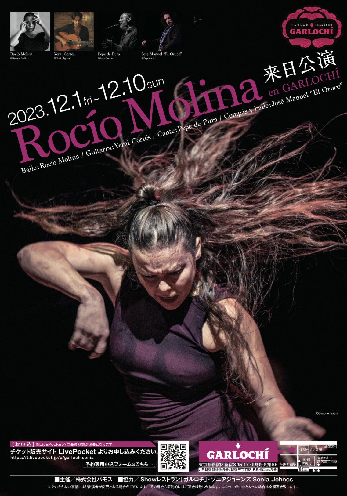 2023/11/14 21:00ガルロチ・クラウドファンディングにご支援いただきました皆様へこの度、ロシオ・モリーナ来日公演 en GARLOCHIを開催する運びとなりました。皆様のおかげで、ガルロチが再始動し、2022年より、“パストーラ&ホセ・ガルバングループ”“メルセデス・デ・コルドバ&ラファエル・カンパージョグループ”“ペペ・トーレス&マヌエラ・バルガスグループ”“フアナ・アマジャ&エル・トロンボグループ” “マリア・モレーノ&エル・ペロングループ”と5組の素晴らしいアーティストを招聘することができました。改めて感謝申し上げます。そして2023年を締めくくるアーティストとして“ロシオ・モリーナ ”の公演が決定いたしました。異次元の凄さを見せてくれる。それがロシオ・モリーナ。身体能力が非常に高く、超絶テクニックで完璧に身体を、場をコントロールしていく。それに加えて、たぐいまれな表現力、群を抜いた創作力で作品ごとに新しい顔を見せ、驚かせ、私たちを魅了し続ける。21世紀を代表する舞踊家の一人として後世に名を残すことは間違いない。(一部抜粋/文・フラメンコ・ジャーナリスト志風恭子)劇場公演の多いロシオがタブラオで魅せる、世界でもここでしか見ることができない珠玉の公演となります。是非ご来場くださいませ。—————————ロシオ・モリーナ来日公演en GARLOCHÍ【ご予約】WEB:https://t.livepocket.jp/t/rociomolinaEmail:garlochilive@gmail.com【出演期間】2023年12月1日(金)〜12月10日(日)開演時間、料金等の詳細はホームページにてご確認くださいませhttps://garlochi-flamenco.com 【出演者】Baile: Rocío MolinaGuitarra: Yerai CortésCante: Pepe de PuraCompás y baile: José Manuel “El Oruco”【場所】Show レストランGARLOCHÍ東京都新宿区新宿3-15-17 伊勢丹会館6F主催/株式会社バモス 後援/スペイン大使館・インスティトゥト・セルバンテス東京・一般社団法人日本フラメンコ協会・公益財団法人スペイン舞踊振興MARUWA財団協力/Showレストラン「ガルロチ」・「ソニアジョーンズ 」Sonia Johnes もっと見る