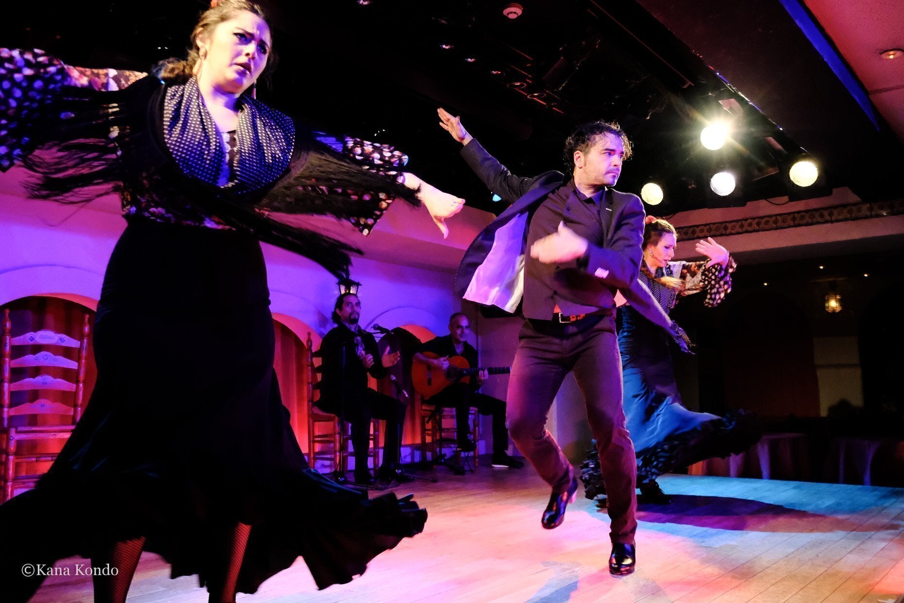 ギタリストが奏でるリズムに合わせて歌い手が自由に歌い、その歌に合わせて、踊り手が感じたままに表現する。時には踊り手が指揮者となって踊りながら合図を送り、ギタリストや歌い手を指揮する。このように演者同士が舞台でかけあいを楽しんでいるのです。