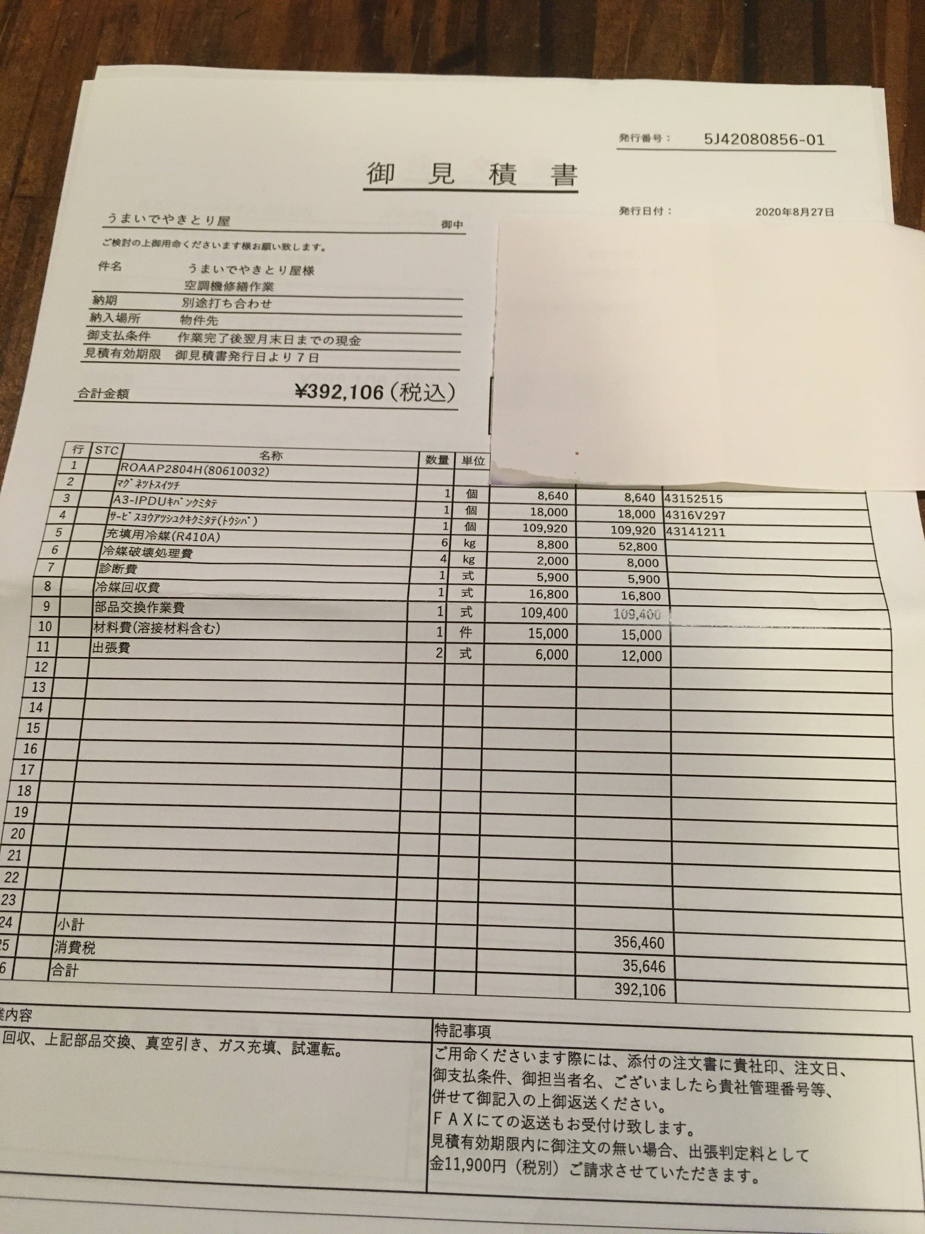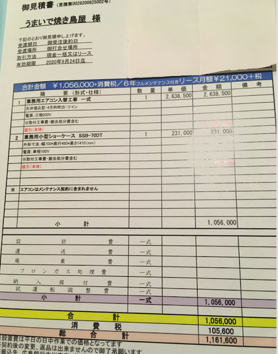 そして悪いことは続くものでジョッキを冷やすために使っている大型冷蔵庫も故障するという最悪の事態にまで発展しました....。そして業者の方から頂いたエアコンの修理費用見積もりと新品交換の見積もり⬇︎⬇︎
