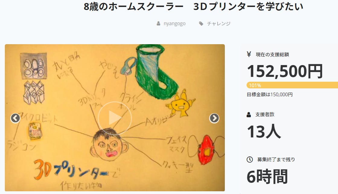 失敗しても、クラウドファンディングをやってみたいという僕のチャレンジは一応成功だとは思うのですが、8月から頑張って準備してきたのに3Dプリンターが買えないというのは、やはり物凄く残念になってしまうので絶対に達成したいです。