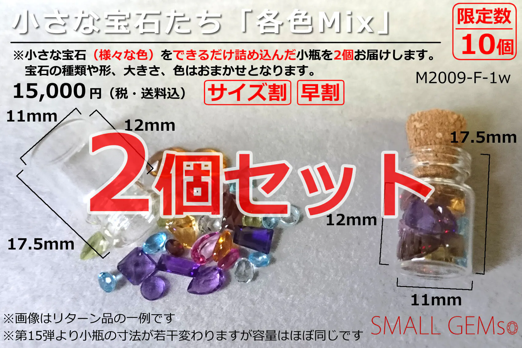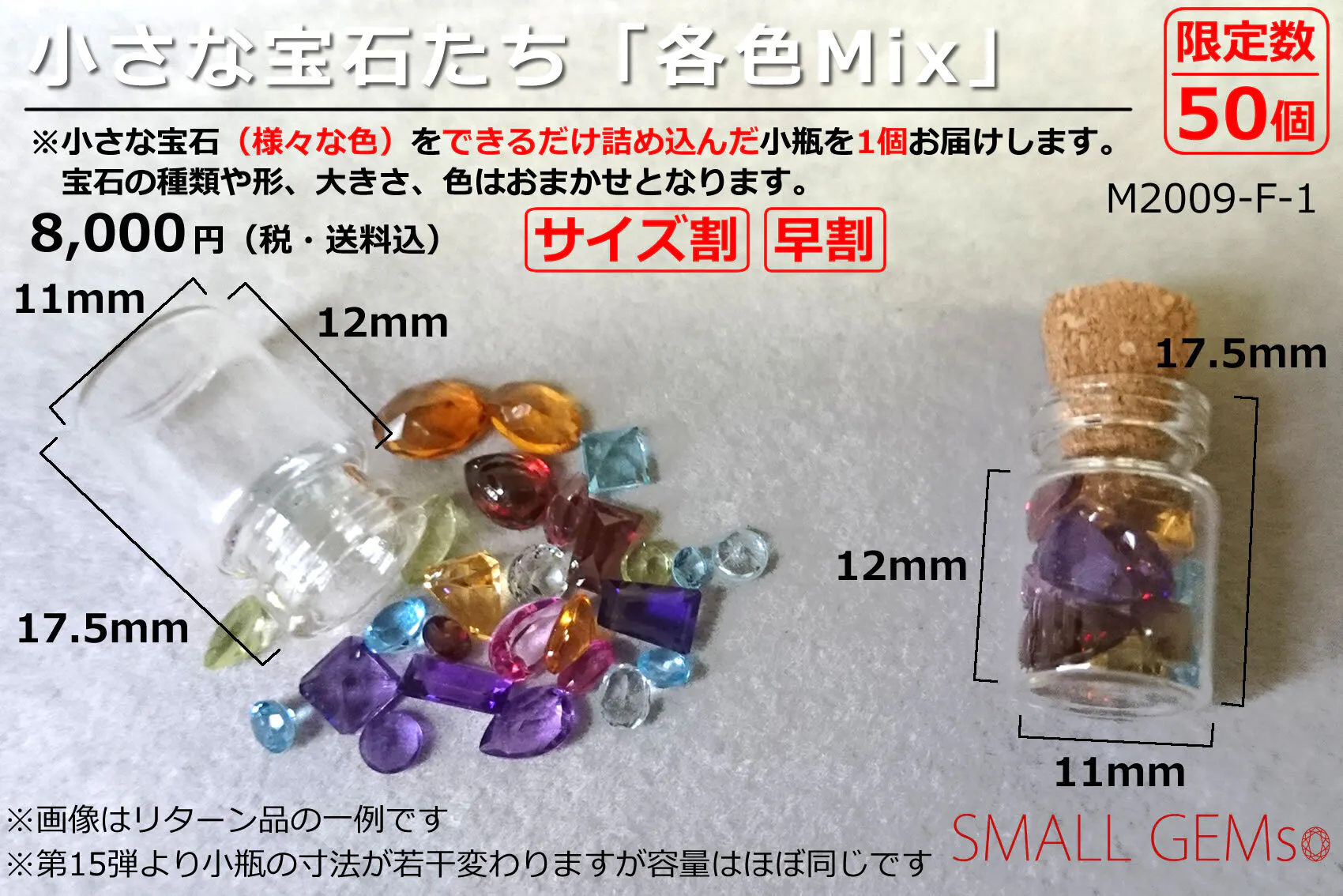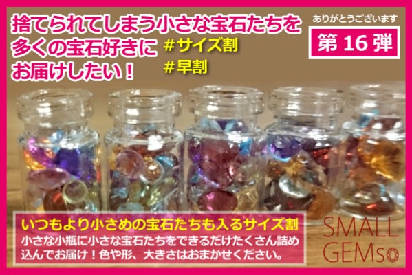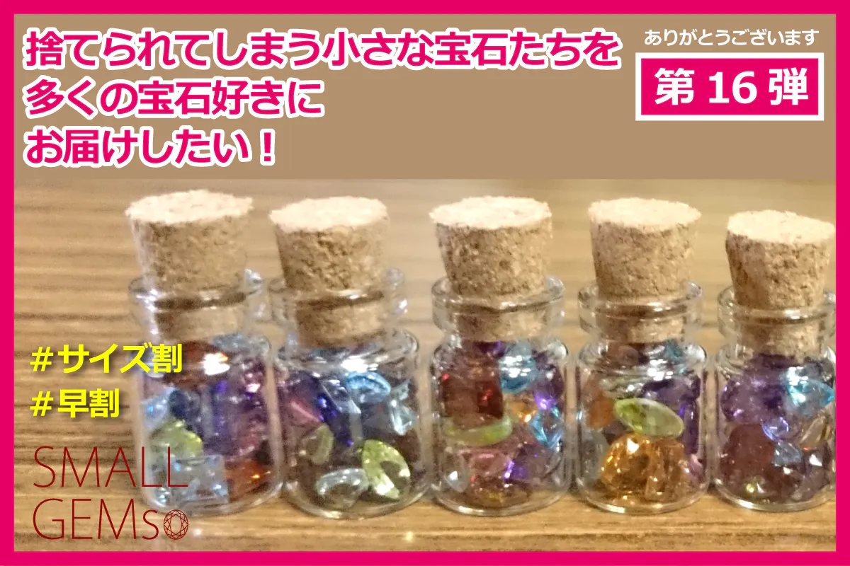 皆さまにお届けする「小さな宝石たち」は通常3mm~4mm程度の宝石を中心にしていますが、少し小さめの2mm程度の宝石の割合を増やした「サイズ割引」を継続いたします。