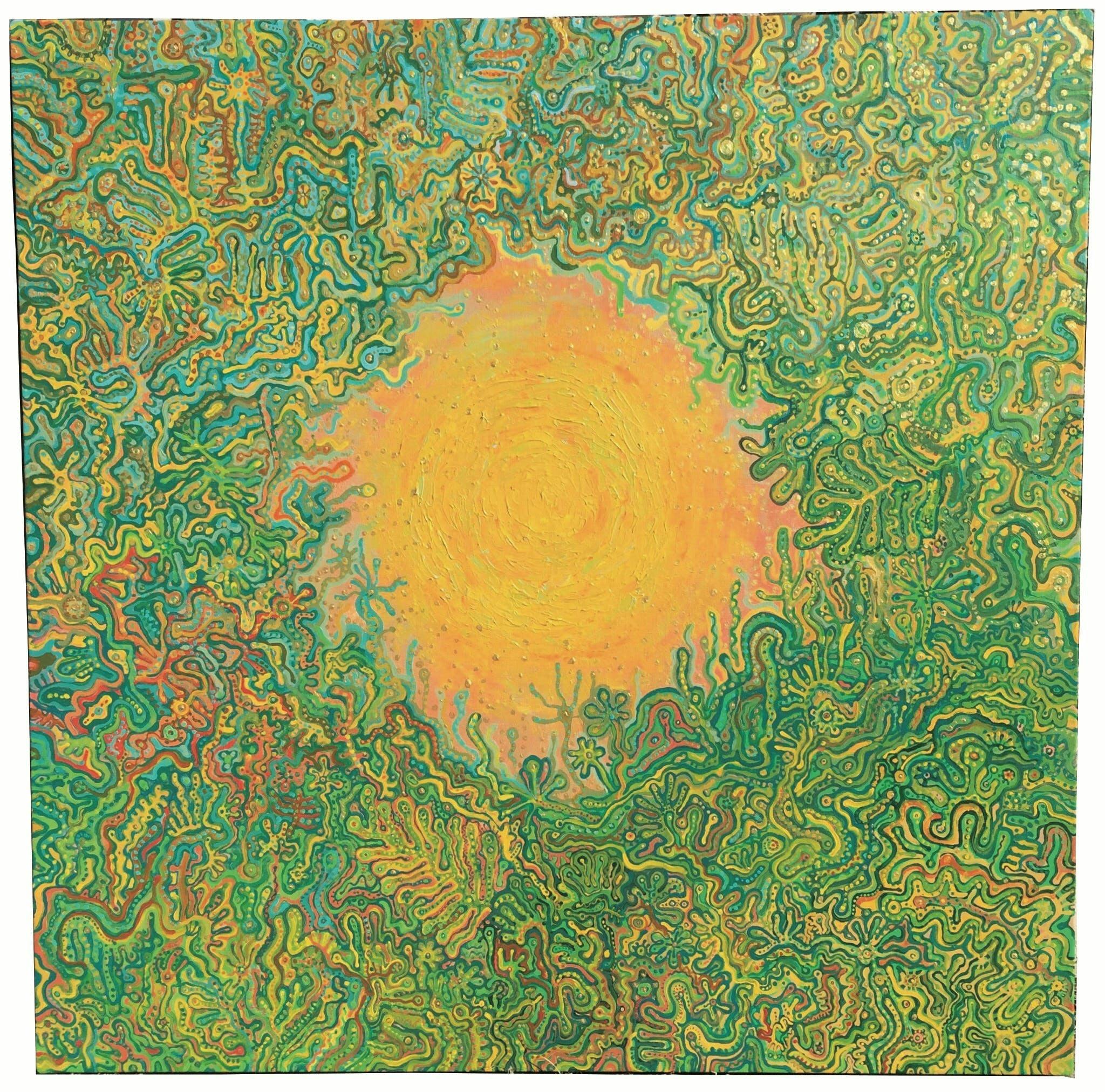 下描きも構成も一切無しに描き始め、全てを直感と本能で描いた結果様々なモチーフが生まれる。