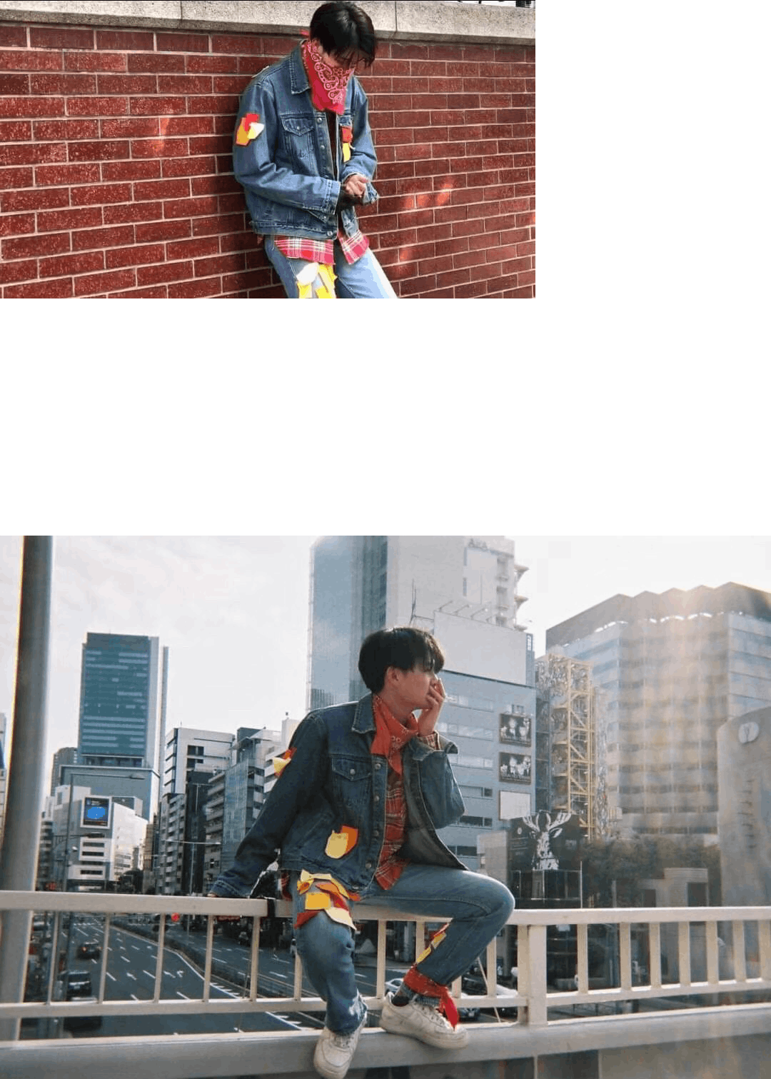 デニムに差し色を赤で統一している中、赤以外の暖色系の布を無造作に貼り付け、遊び心を表現。スタイリングは映画の登場人物であるジョンとアンドリューをミックスさせたイメージ。