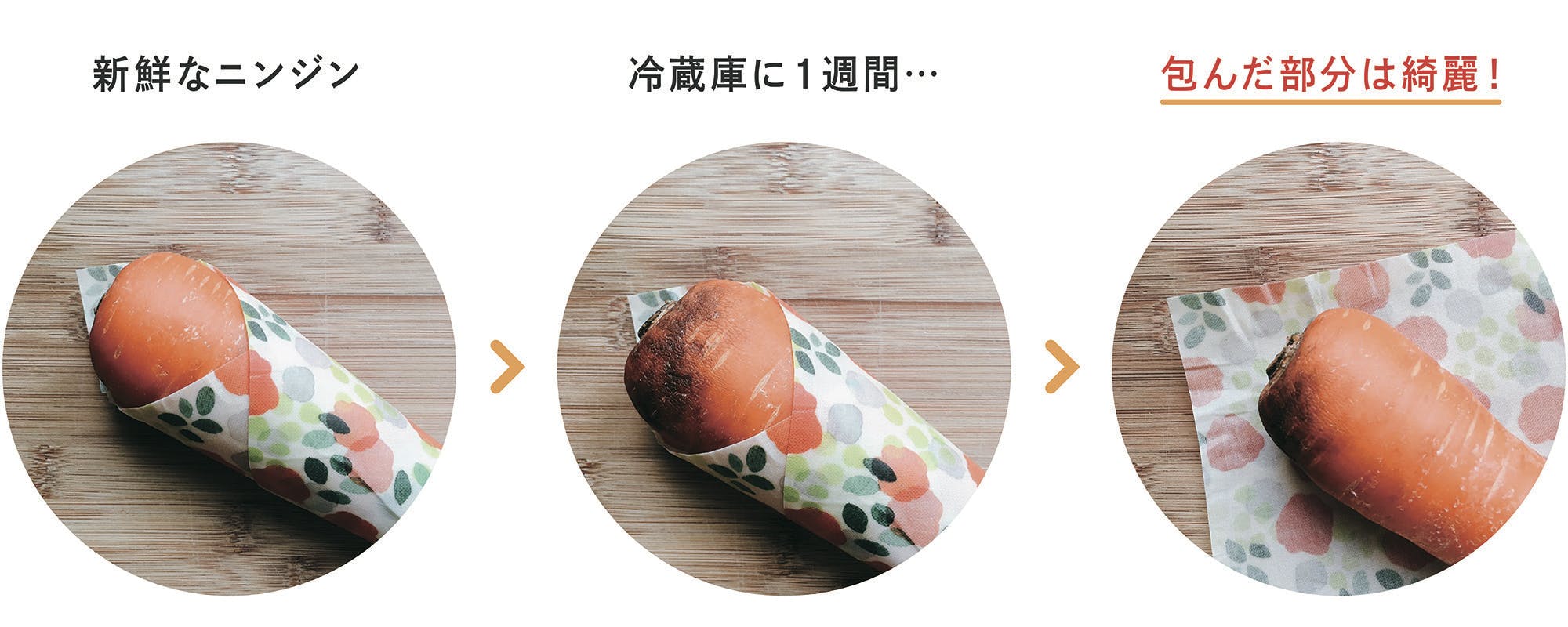 ミツロウラップでくるくるっとお野菜や果物を包んで保存します。食べものは適温で保存していても、空気に触れると「酸化」し劣化しますが、ミツロウラップで包むことで劣化を遅らせることができます。